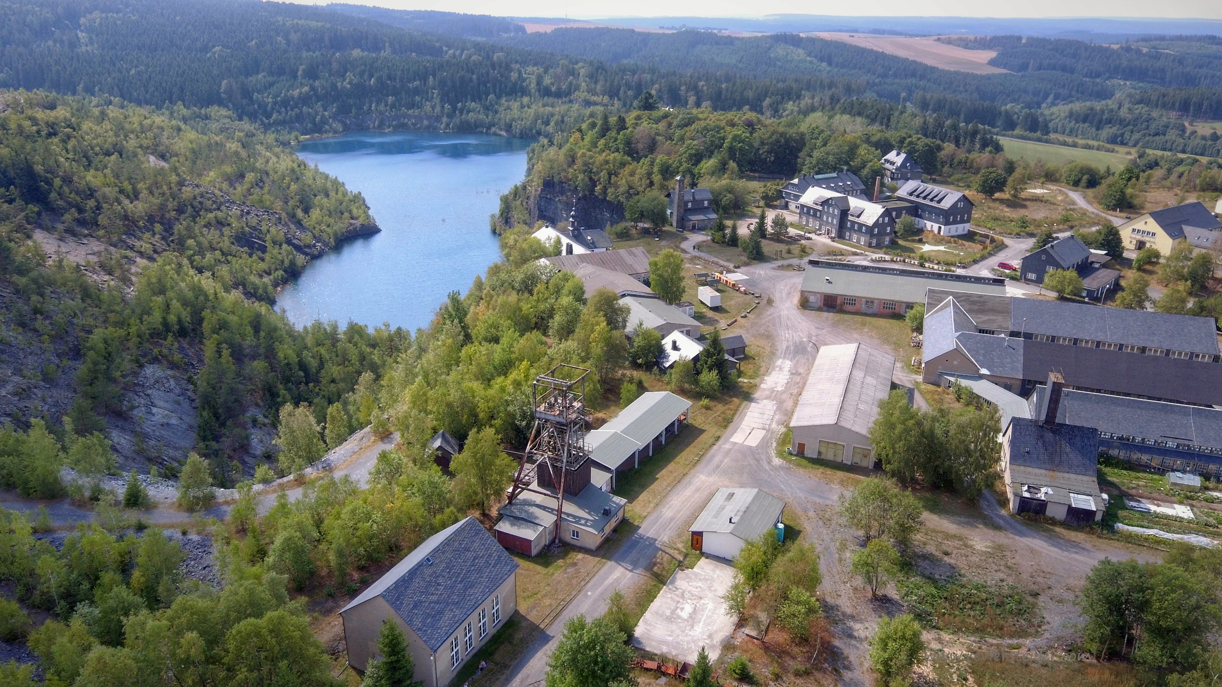 Schieferbergwerk Lehesten, Staatsbruch und Kießlichbruch mit Fördergerüst Schacht 4, Spalthütten, Werkstätten, ehemaligen Verwaltungsgebäuden und dem (Dampf)fördermaschinengebäude von Schacht 1 (oben Mitte, m. Kamin).