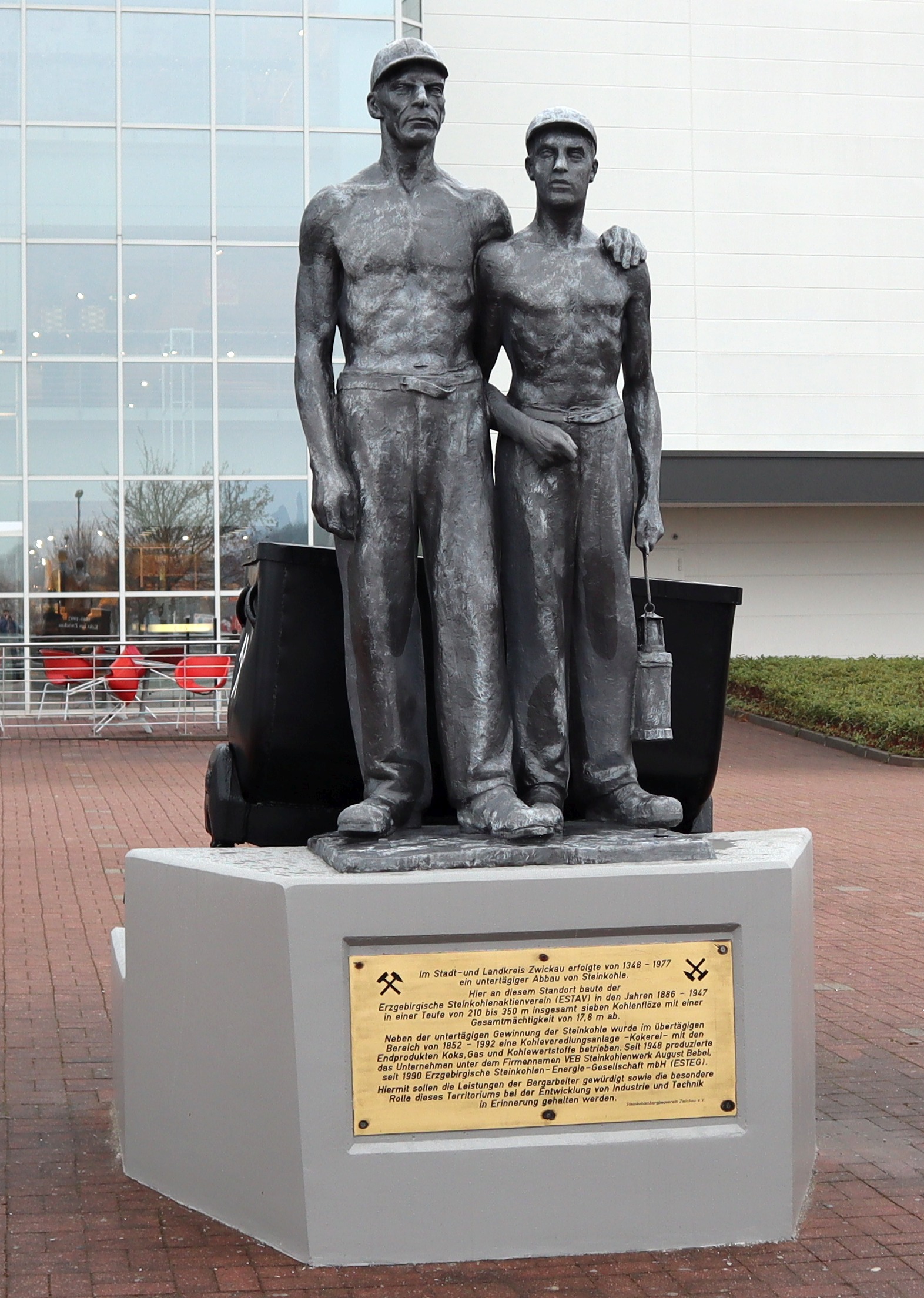 Plastik von Edmund Jorisch, Alter und junger Bergmann, etwa 1953. Im Volksmund auch "Vater und Sohn". Stand bis Mitte der 1990er vorm Werkstor der Steinkohlenkokerei "August Bebel" in Zwickau, nach der Stilllegung jetzt auf dem Gelände eines Einkaufszentrums (innerhalb des ehem. Werksgeländes).
