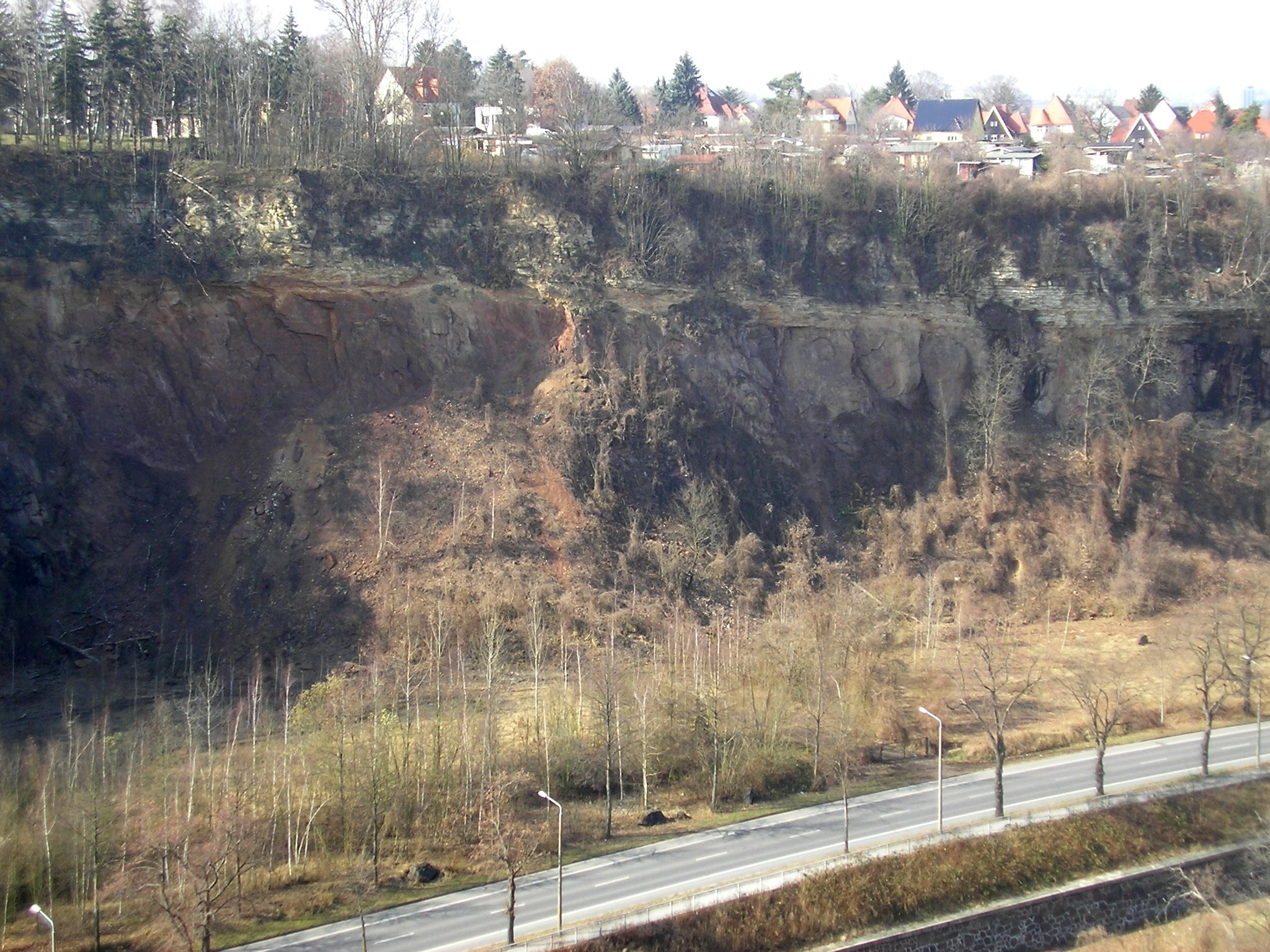 der Communionsteinbruch am Rammelsberg. Mal aus einem anderen Winkel als die übliche Postkartenansicht. Hier wurde vor Inbetriebnahme der "Schiefermühle" unterdevonischer Sandstein als Versatzmaterial gewonnen und mittels Haldensturz und Bremsberg zu den tiefergelegenen Schächten (Kanekuhler-, Flacher- und Winkler-Schacht) gebracht.