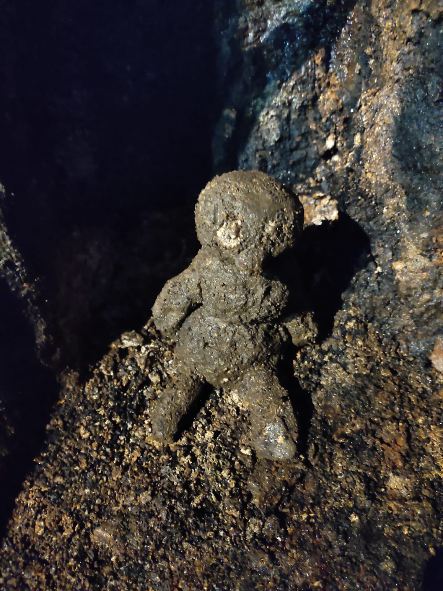 Dieses "Bergmännchen" wurde in einem Bereich entdeckt, wo schon sehr lange niemand mehr unterwegs war. Uns verblüffte vor allem die Liebe zum Detail: Arschleder, Tscherpertasche mit zwei Holzstäbchen für die Messer,Blende und eine Pfeife präsentierten einen Bergmann, der sicherlich nicht in nur 5 Minuten entstand. Jedoch wurden nun auch Unstimmigkeiten in der Gruppe ausgelöst. Der Meinung, es handelt sich um ein Kunstwerk der Altvorderen stand die Behauptung entgegen, dass es sich dabei einfach nur um eine Geigelei einer früheren Befahrergruppe handelt. So wurde bei etliche "Befahrerlegenden" nachgefragt, doch niemand wußte etwas dazu. Wir haben es schon fast aufgegeben, da fiel mir ein noch jemand ein. Prompt kam die Antwort:
