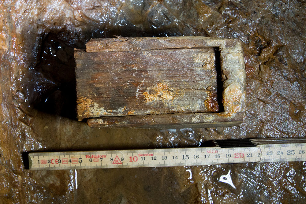 Ich kann zum Verwendungszweck dieser Kiste keine sicheren Informationen geben. Die vergleichbar großen Holzbehälter, die meine Freunde und ich vor Jahrzehnten im Alten Mann gefunden haben, waren immer Bohrtröge ohne Deckel gewesen und haben ursprünglich den Lettenbesatz oder Wasser enthalten. Das Wasser diente beim Bohren nach unten zur Befeuchtung des Bohrkleins, führte durch das Befeuchten zu einer breiigen Masse und ließ sich dadurch durch den Krätzer leichter entfernen.
