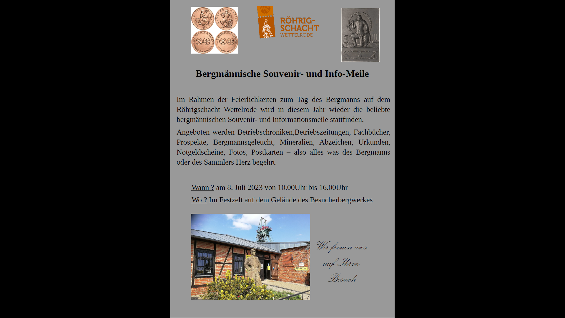 Im Rahmen der Feierlichkeiten zum Tag des Bergmanns auf dem Röhrigschacht Wettelrode wird in diesem Jahr wieder die beliebte bergmännischen Souvenir- und Informationsmeile stattfinden. Angeboten werden Betriebschroniken,Betriebszeitungen, Fachbücher, Prospekte, Bergmannsgeleucht, Mineralien, Abzeichen, Urkunden, Notgeldscheine, Fotos, Postkarten – also alles was des Bergmanns oder des Sammlers Herz begehrt.