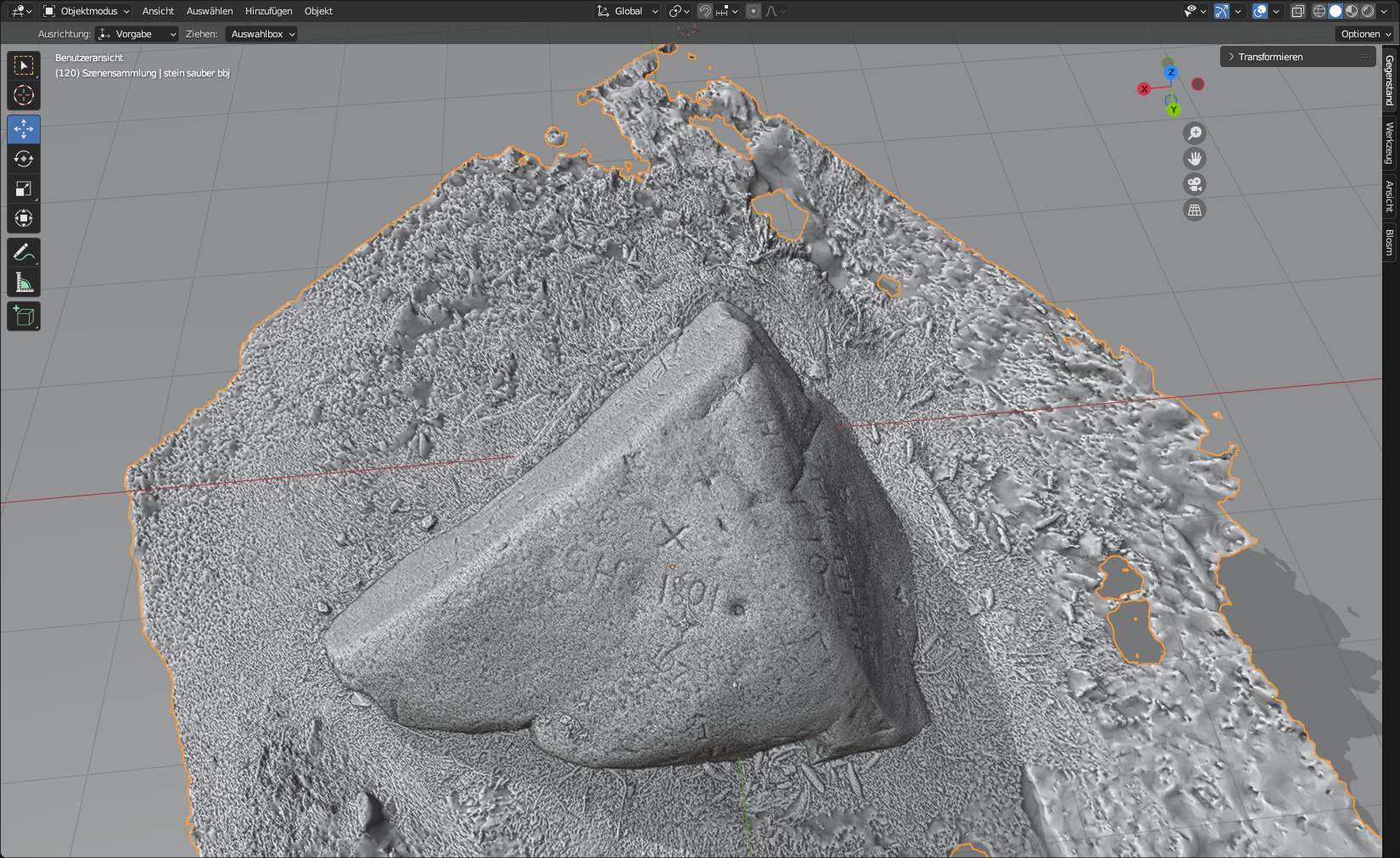 Als Testobjekte diente der Markscheider-Stein aus dem Greifenbachtal. Es wurden insgesamt 251 Fotos geschossen und daraus ein 1:1 ein 3D Modell berechnet. Siehe den Link dazu.