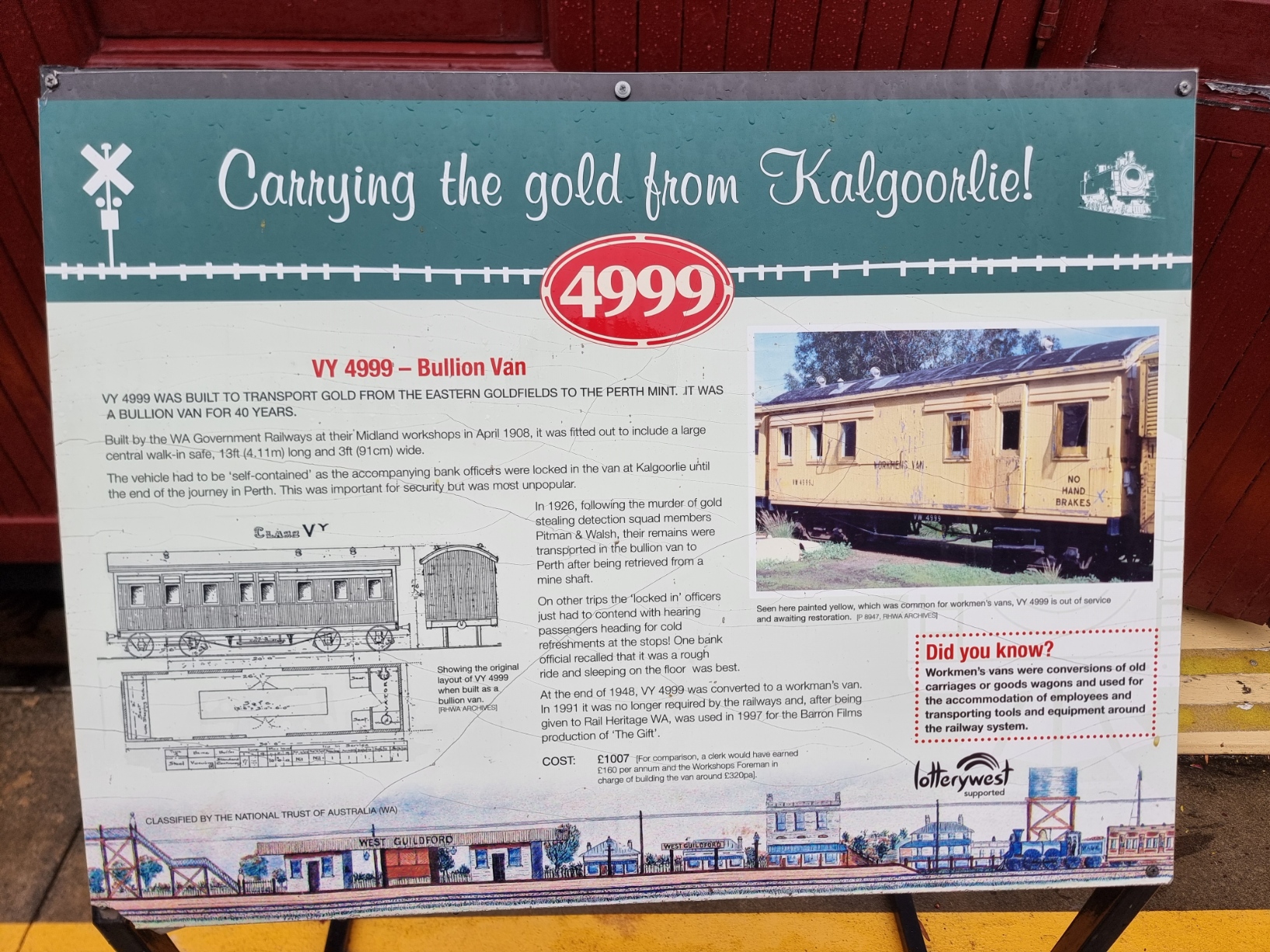 Mit dem gezeigten Wagon wurde von 1908 bis 1948 das Rohgold von den Bergwerken im Zentrum West Australiens nach Perth zur Muenze gebracht. Das Sicherheitpersonal wurde mit dem Gold in Kalgoorlie im Wagon eingeschlossen und es wurde erst in Perth wieder geoeffnet.