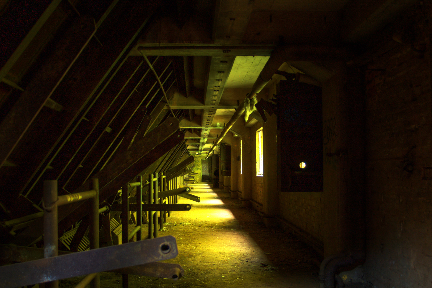 Die Hebel auf Zwischenboden, auf dem das Bild aufgenommen wurde dienten zum Öffnen der Rollenschnauzen der Erzbunker. Eine Ebene höher lag das Gleis der Schmalspurbahn, von wo aus das Erz in die Bunker gestürzt wurde, eine Ebene tiefer das Gleis der Ilseder Hütte, wo dann die Normalspurwagen befüllt wurden.