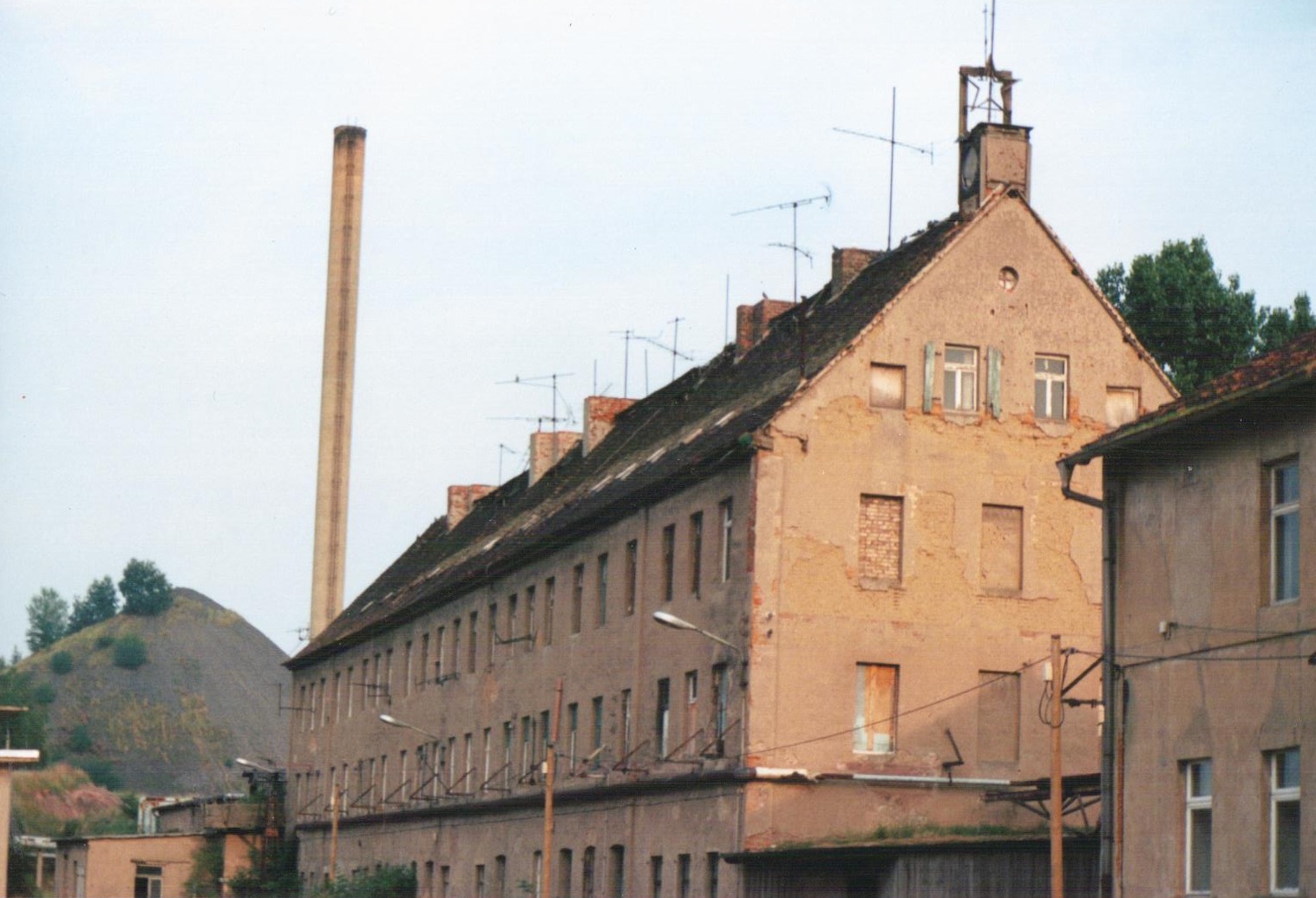 Die ehemalige Grube "Carl Moritz", später VEB Steinkohlenwerk Plötz im Jahr 1996. Man beachte den Roten Stern am Schornstein. Da er nicht leuchtet, wurde offensichtlich der Plan nicht erfüllt. Leider habe ich es nicht geschafft ihn für ein Museum zu bergen.