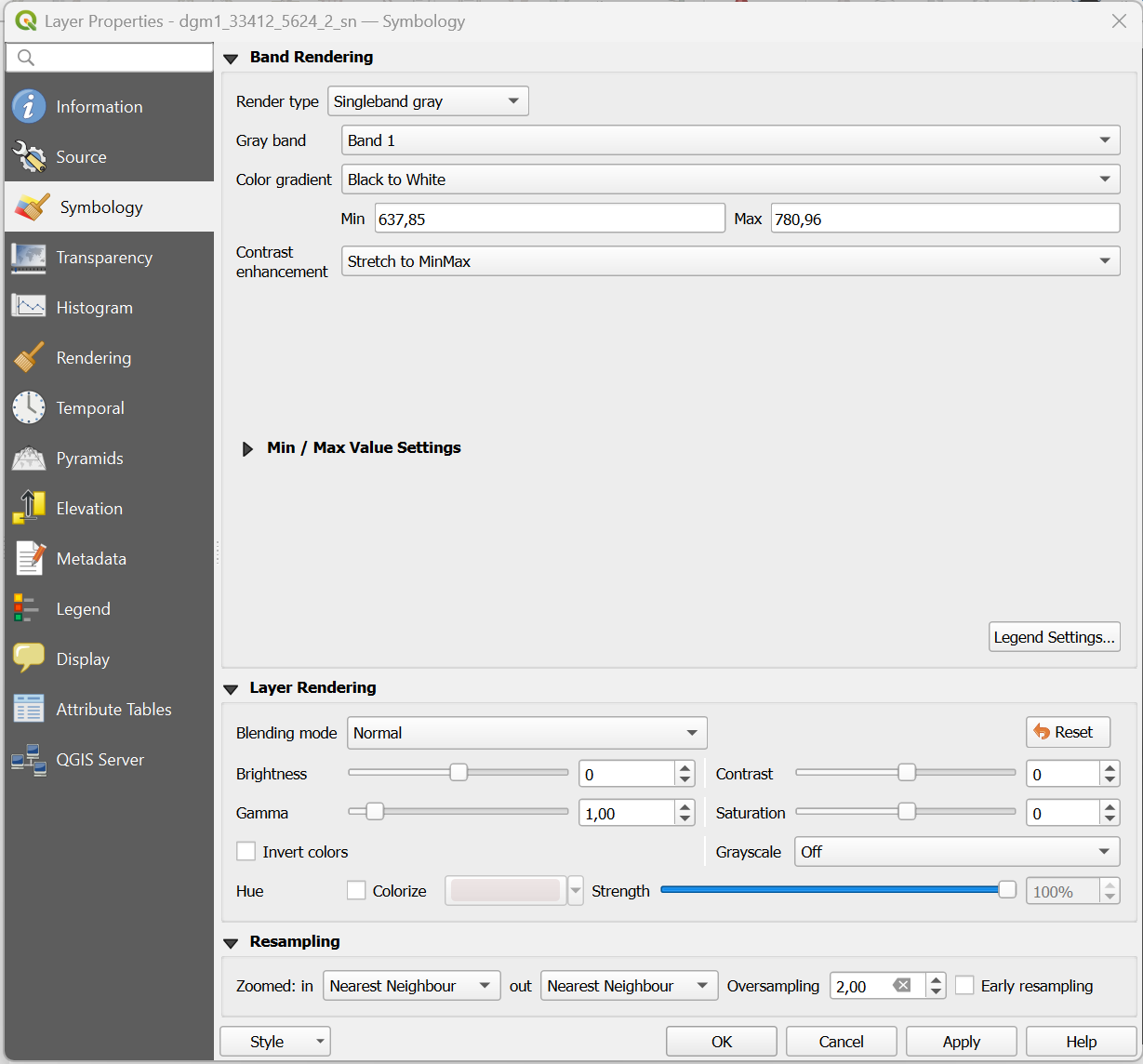 Falls es noch nicht bekannt ist, man kann die Schummerung unter Symbologie deutlich ansehnlicher machen, indem man im Feld Abtastung die beiden Zoom-Einstellungen von "Nächster Nachbar" auf "Kubisch" ändert und den Wert für "Überabtastung" auf mindestens 4 hochsetzt.erzbergbau hat geschrieben: ↑Mi. 22. Jan 25 13:02 Die Schummerung über die Ebenen-Symbolisierung ist nicht ideal, da es (zumindest bei mir) zu Artefakten in der Darstellung kommt, wenn man stark in die DGMs zoomt. Deutlich bessere Qualität erhält man durch Raster -> Analyse -> Schummerung, wobei die DGM-Ebene als Eingabeebene dient. Hierbei wird eine neue Ebene erzeugt mit der Schummerung.