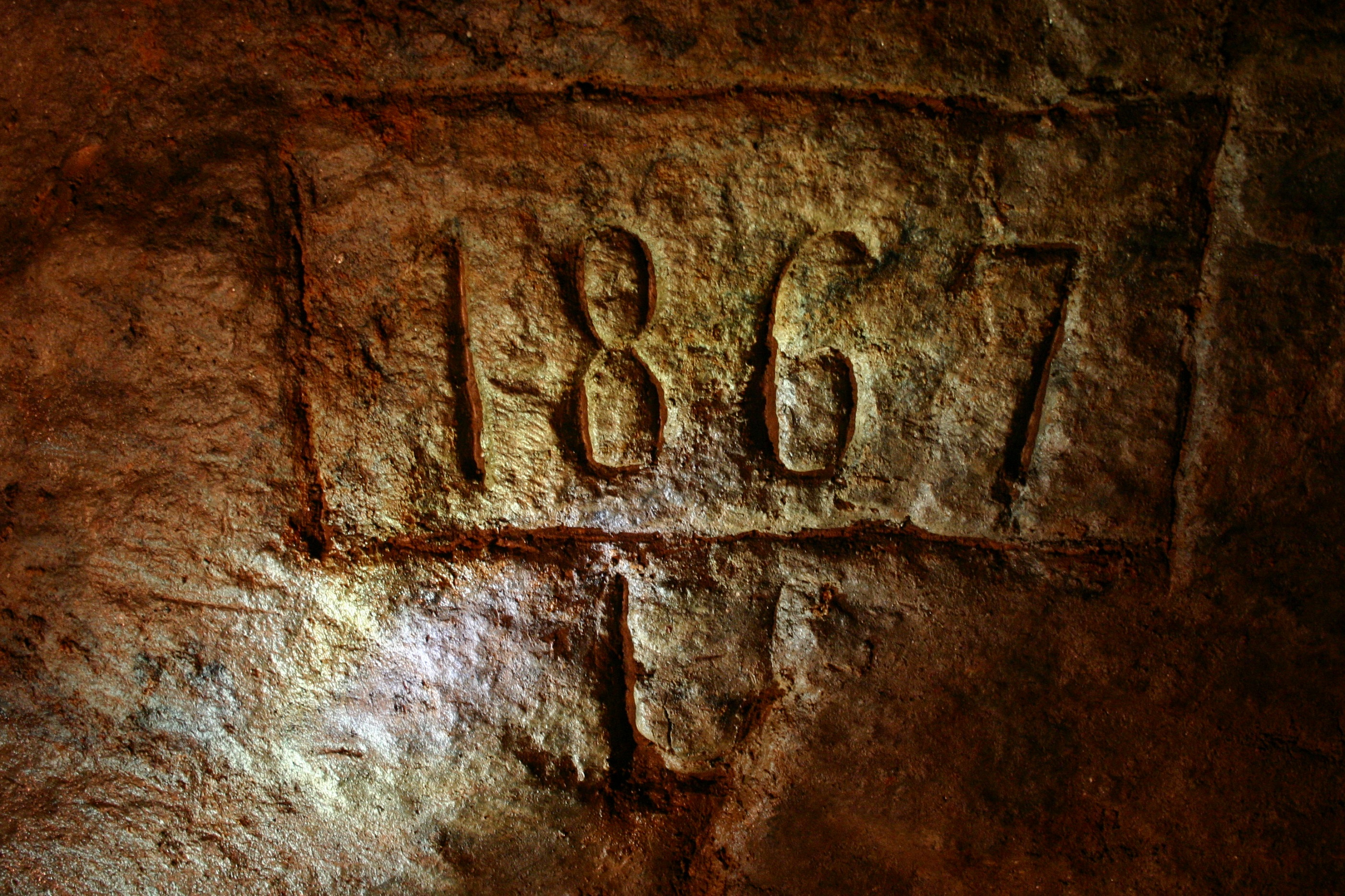 Die aufwendigste und schönste Inschrift im Pfälzer Revier in einem kleinen Quecksilberbergwerk in der Nordpfalz. In dem Stollen befinden sich neben dieser Inschrift noch weitere interessante Inschriften. Hier scheint sich jemand ausgetobt zu haben!