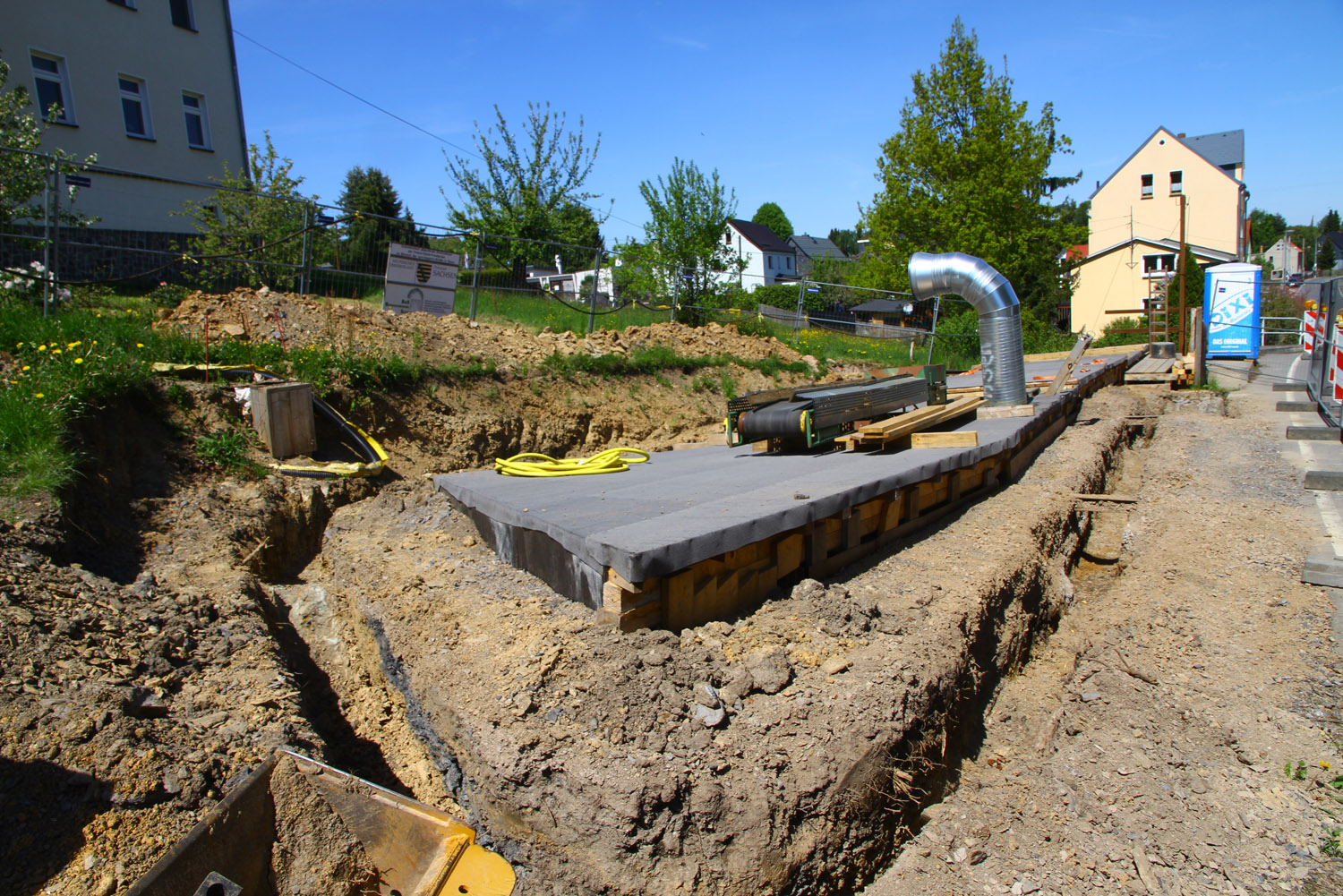Inzwischen sieht man in der Ortslage in Höhe HG 24 nur einen eingesenkten zugezimmerten Kasten: