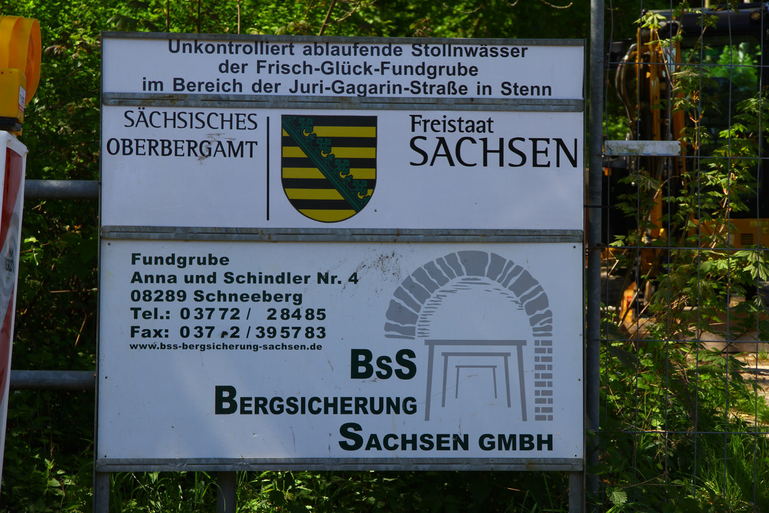 Das Baustellenschild spricht von "unkontrolliert ablaufenden Stollnwässern":