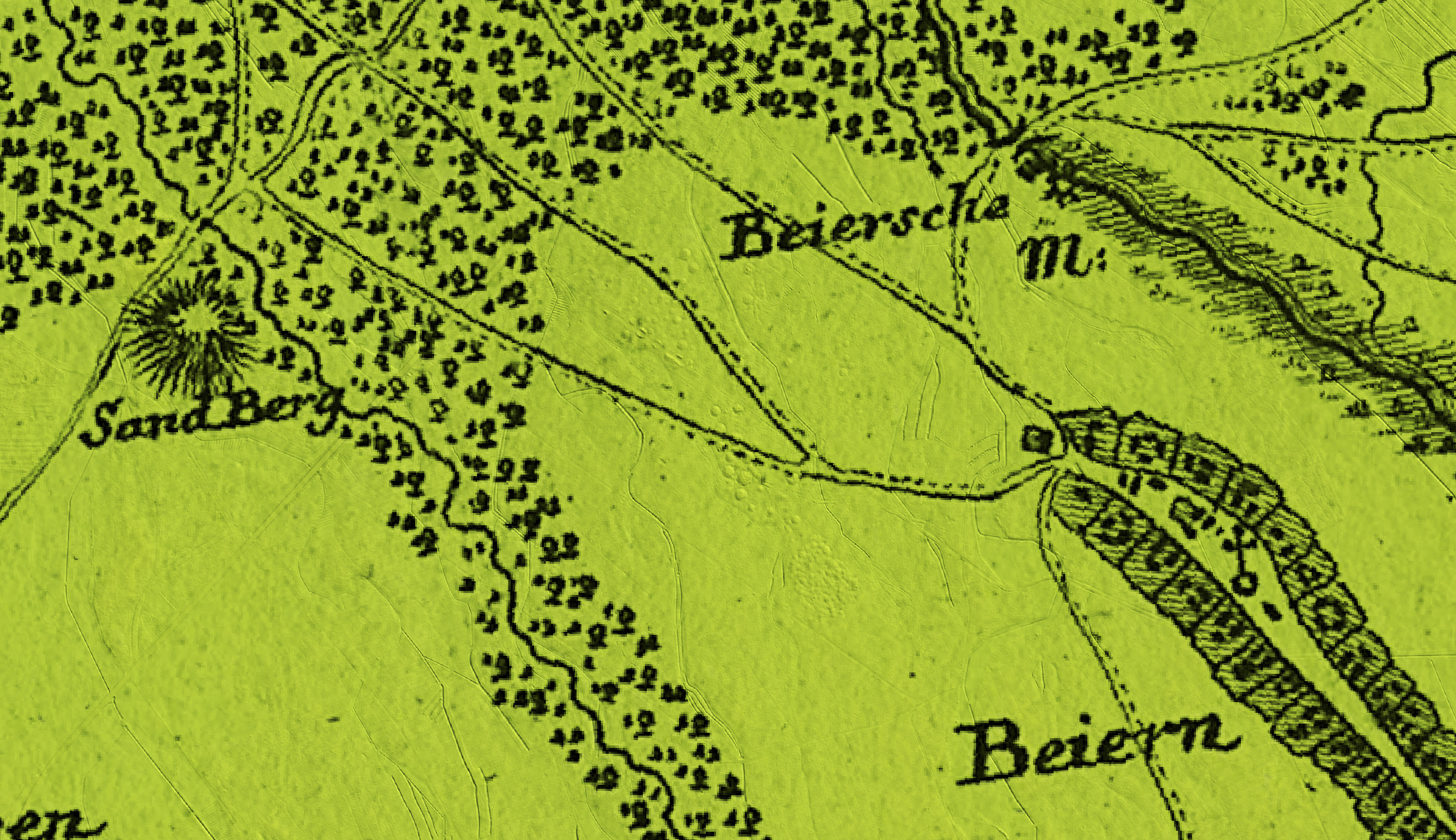 Sorry für den Doppelpost, hier mein Versuch, den Sandberg zu lokalisieren und die Strukturen, die im DGM zu erkennen sind, zu erklären. Gleich vorweg, die folgenden Punkte stützen sich nur auf das DGM und die Georeferenzierung alter Landkarten. Um die Richtigkeit zu überprüfen, ist auf jeden Fall eine Geländebegehung erforderlich.