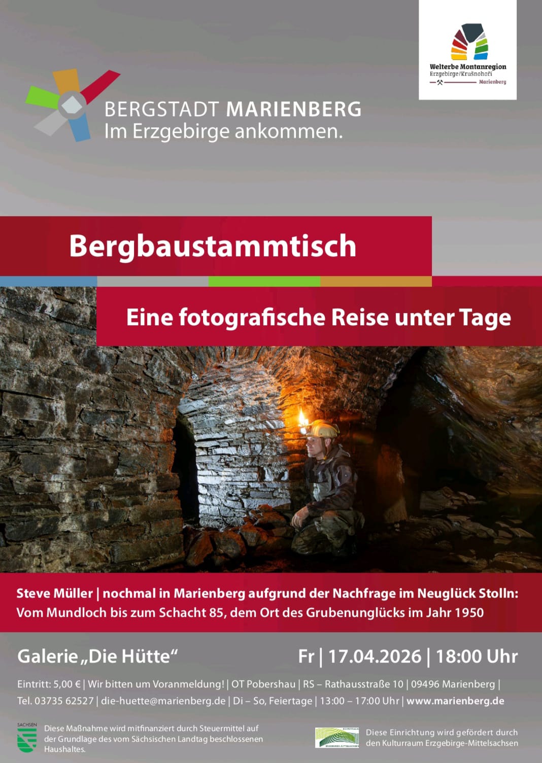 Gezeigt werden faszinierende Fotografien aus dem gesamten Neuglücker Stolln sowie ein eindrucksvolles Video von der Unglücksstelle, rund 180 Meter unter der Drei-Brüder-Höhe im Kiesholz. Eine Reise in die Tiefe – und in ein verborgenes Kapitel sächsischer Bergbaugeschichte.