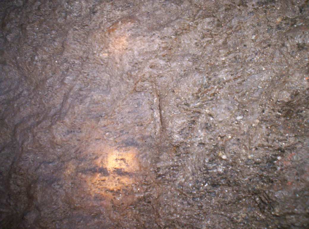 Kürzlich habe ich bei der Befahrung einer Quecksilbergrube in der Nordpfalz eventuell ein mit Letten gezeichnetes Gedingezeichen entdeckt (siehe Foto). Es scheint mir original zu sein, da dieses in einem Barytgang folgenden Querschlag liegt, der durch stark verwitterten und kaolinisierten Dazit führt. Dort kann ein Gedingezeichen nicht sauber eingeschlagen werden und würde eventuell auch nicht lange halten. Außerdem ist das Gedingezeichen in einer Art nischenartigen Einbuchtung angebracht, sowie mit in der Grube vorhandenen Letten aus Linomit gemalt.