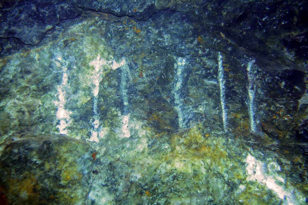 die sind ja unter wasser, also kann man ausschließen, dass es das *gesteinsmehl* vom einschlagen der stiche ist. sinter? farbe?