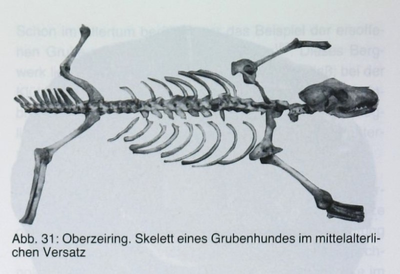 Wenig bekannt dürfte sein, daß in dem im 14. Jahrhundert durch Wassereinbruch untergegangenen Silberbergwerk von Oberzeiring in Österreich, offensichtlich Hunde zur Förderung in den engen Strecken eingesetzt worden waren: Wie sollte man sich anders die große Zahl von Hundeskeletten erklären, die im Versatz bei der Herrichtung des oberen Teils der Grube als Besucherbergwerk entdeckt worden waren (Abb.31).“