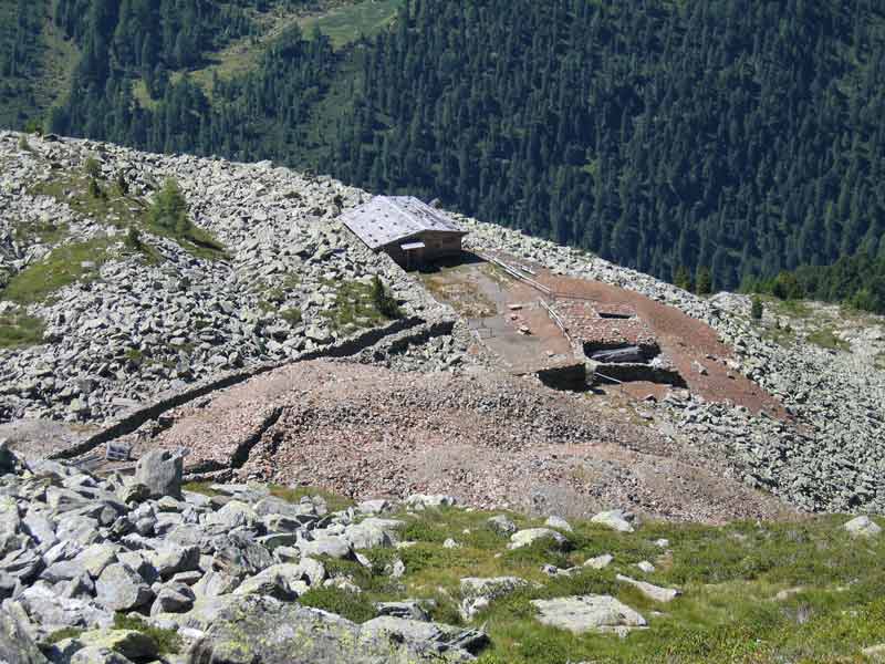 Überblick über die Anlagen (renoviertes "Knappenwohnheim", Schneekragen und Halden des ehemaligen Bergbaues im Trojeralmtal, St. Jakob im Defereggental, Osttirol, Österreich.