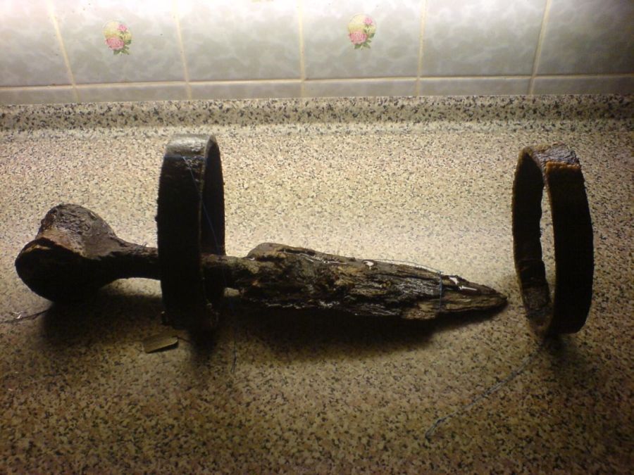 mich erinnern die Fragmente an Verstärkungen, die auf Holzwellen an den Stirnseiten aufgeschlagen wurden um eine bessere Lagerung zu ermöglichen. Wobei der Dorn jeweils die Führung in der Holzwelle übernimmt und der Ring die Welle umfasst und ein Aufreissen verhindert. Mir ist das schonmal bei Getreidemühlen hier in unserer Region begegnet, wo der hölzerne Wellbaum des Wasserrades derart gelagert war. Der Durchmesser so eines Wellbaumes liegt bei rund 50 cm.