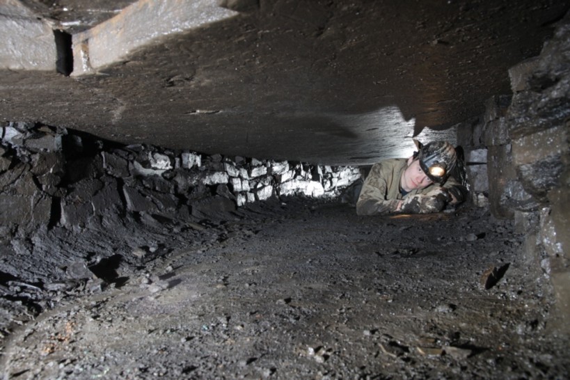 Herrichten eines Kurzstrebes im Streichen. Der Streb wurde wahrscheinlich während der Auffahrung des Bremsberges in der letzten Betriebsperiode der Zeche Graf Wittekind zur Gewinnung von Hausbrandkohlen genutzt. Flözmächtigkeit knapp 40cm.