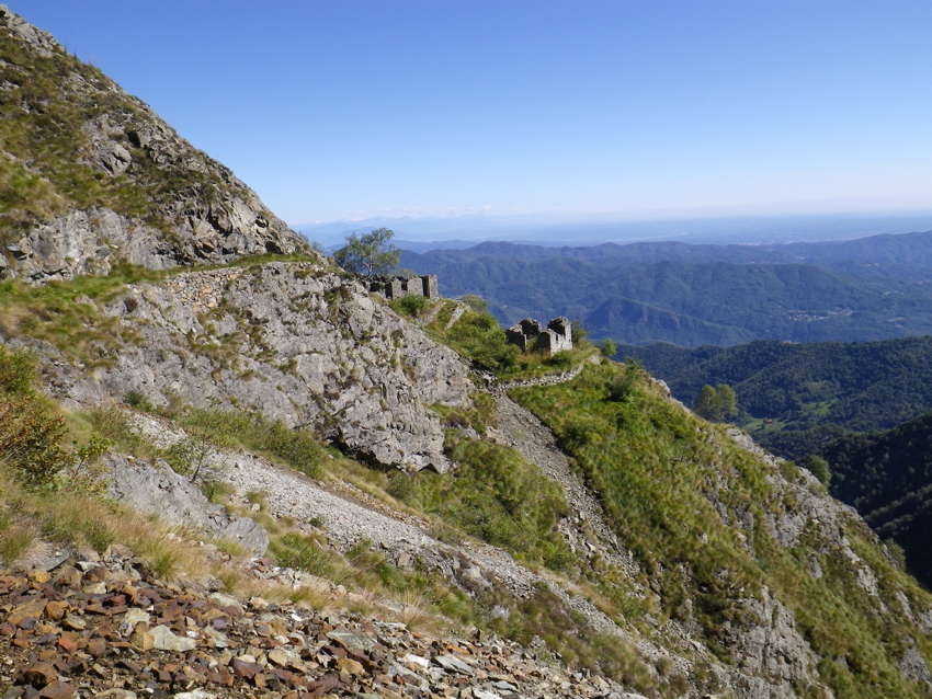 Mine mit Aussicht - ehemalige Wohngebäude einer Kupfermine in Norditalien. Unten links ist ein Teil der rostroten Halde zu sehen, Hauptmineral ist Magnetkies. Abgebaut wurde nur eine recht kleine Linse, aber in Anbetracht des zweistündigen Anstiegs waren die Gebäude wohl gerechtfertigt...