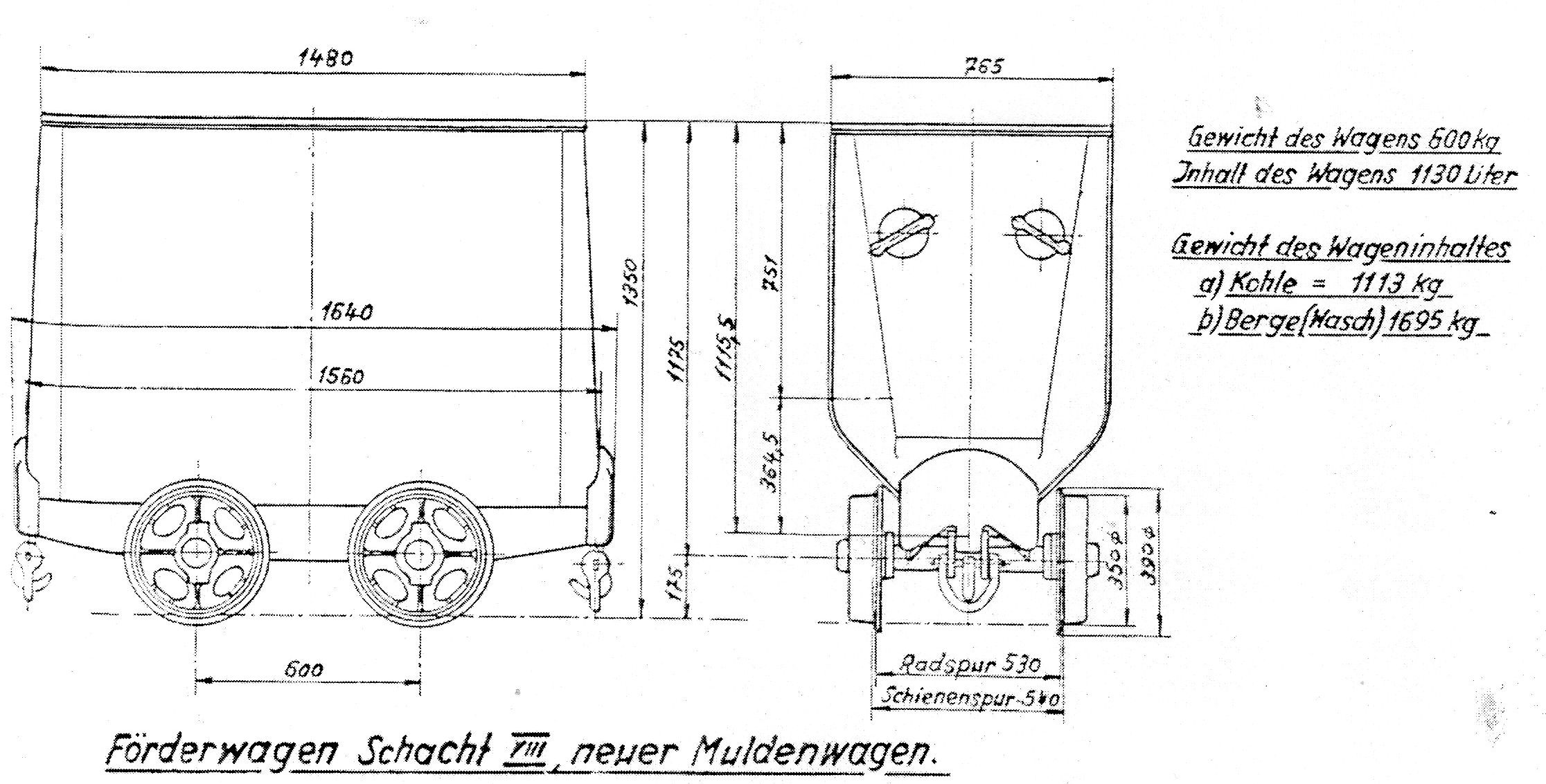 Es ist auf jeden Fall ein westdeutsches Fabrikat, den die meisten ostdeutschen hatten Gummiklötze in die Puffer eingesetzt bzw. waren aufgrund ihrer Form als typische Wismut-Wagen erkennbar. Von den Abmessungen her ist es ein Kleinförderwagen (Fritzsche, Bergbaukunde, 10. Auflage, S. 359), starre Radsätze deuten ebenfalls darauf hin. Vom Gewicht her würde ich 1/2 Tonne ansetzen. Bei 800 kg hätte ich in den letzten Jahren wohl arge Transportprobleme bekommen. Kupplung ist eine Pierburg-Kupplung. Aber auch da gab es Bergwerke wie der Rammelsberg, wo drei verschiedene Hakenkupplungstypen + Pilzkopfkupplung gemischt im Einsatz waren. Baujahr wahrscheinlich nach den 30er Jahren, vorher hatten sie es mit Schweißnähten nicht so.