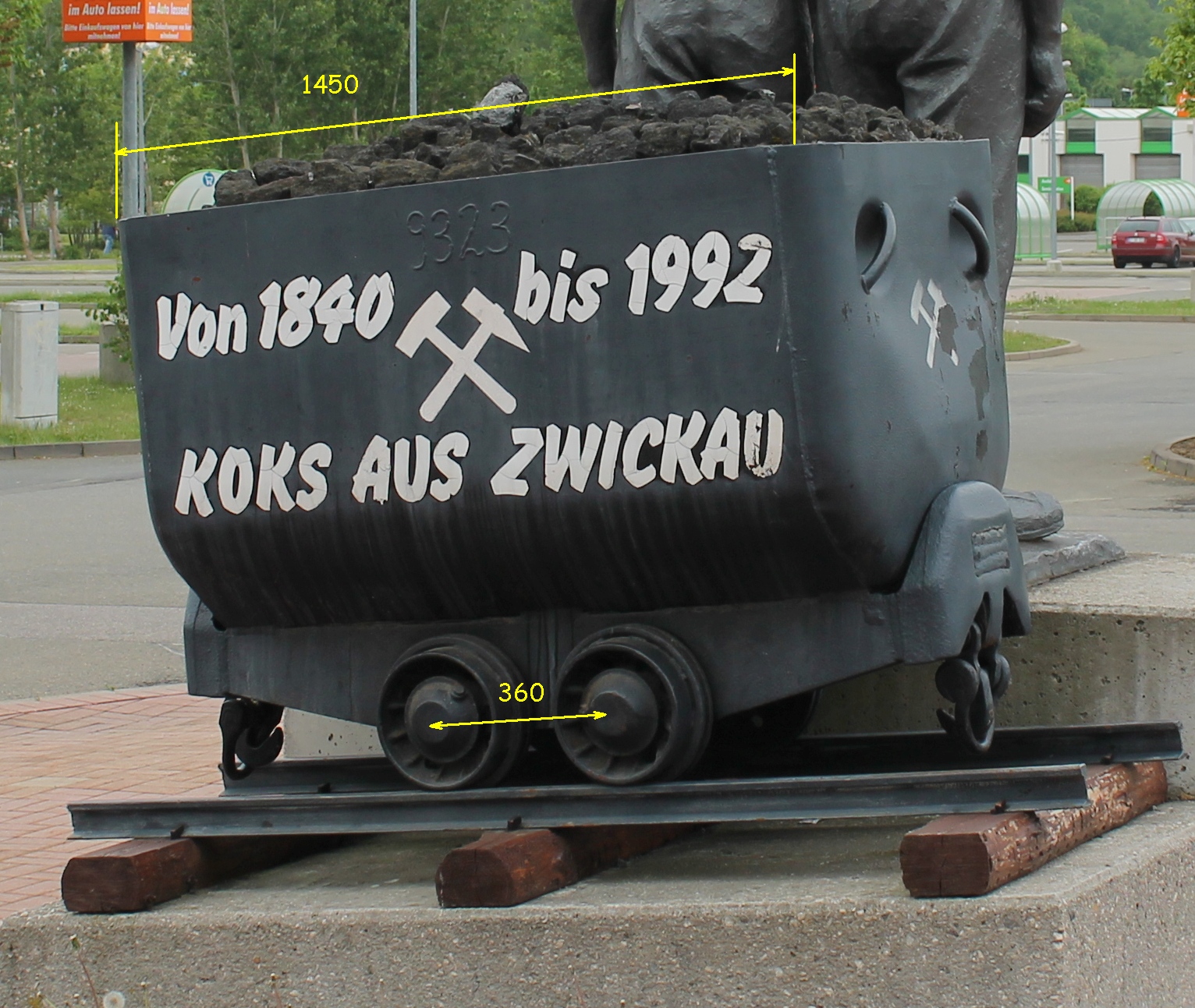 Es ist auf jeden Fall ein westdeutsches Fabrikat, den die meisten ostdeutschen hatten Gummiklötze in die Puffer eingesetzt bzw. waren aufgrund ihrer Form als typische Wismut-Wagen erkennbar. Von den Abmessungen her ist es ein Kleinförderwagen (Fritzsche, Bergbaukunde, 10. Auflage, S. 359), starre Radsätze deuten ebenfalls darauf hin. Vom Gewicht her würde ich 1/2 Tonne ansetzen. Bei 800 kg hätte ich in den letzten Jahren wohl arge Transportprobleme bekommen. Kupplung ist eine Pierburg-Kupplung. Aber auch da gab es Bergwerke wie der Rammelsberg, wo drei verschiedene Hakenkupplungstypen + Pilzkopfkupplung gemischt im Einsatz waren. Baujahr wahrscheinlich nach den 30er Jahren, vorher hatten sie es mit Schweißnähten nicht so.