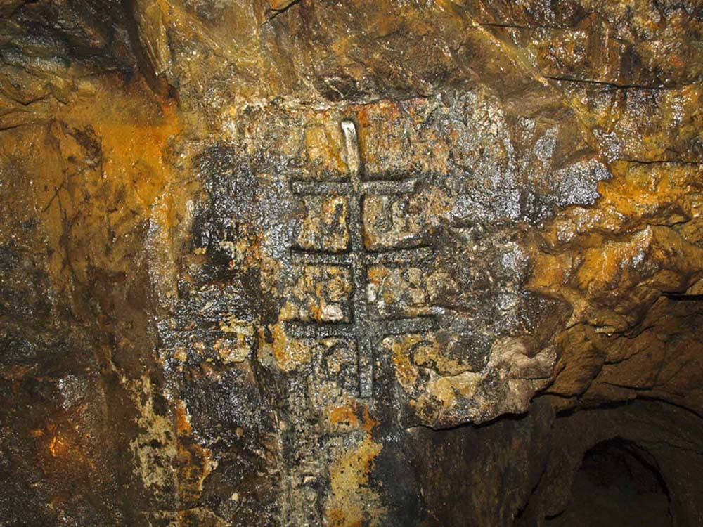 Kürzlich habe ich bei der Befahrung einer Quecksilbergrube in der Nordpfalz eventuell ein mit Letten gezeichnetes Gedingezeichen entdeckt (siehe Foto). Es scheint mir original zu sein, da dieses in einem Barytgang folgenden Querschlag liegt, der durch stark verwitterten und kaolinisierten Dazit führt. Dort kann ein Gedingezeichen nicht sauber eingeschlagen werden und würde eventuell auch nicht lange halten. Außerdem ist das Gedingezeichen in einer Art nischenartigen Einbuchtung angebracht, sowie mit in der Grube vorhandenen Letten aus Linomit gemalt.