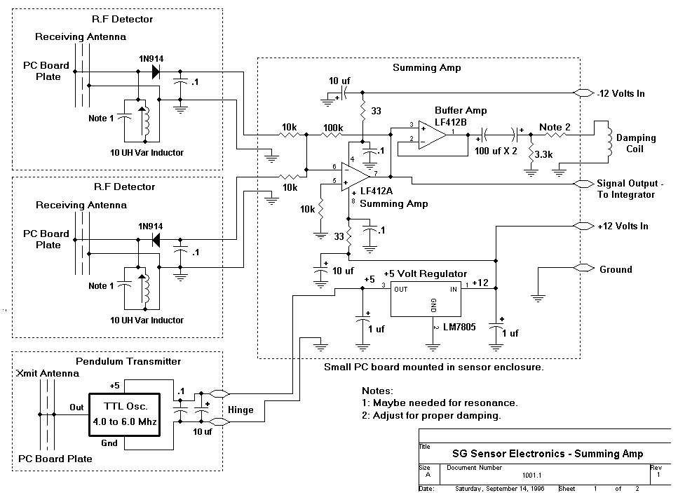 Ich habe im Netz eine Schaltung gefunden, die das Prinzip auf einfache und höchst effiziente Weise verwirklicht und habe sie auch nachgebaut und getestet. Die Ergebnisse sind ähnlich gut wie beim Kapazitiven Sensor. Ich habe nur die Versorgungsspannung symmetrisch auf plus minus 12Volt festgelegt, ebenso wie den Offsetabgleich, um auch negative Ausgangsspannungen zu erhalten. Warum, steht im Abschnitt AD-Wandler...