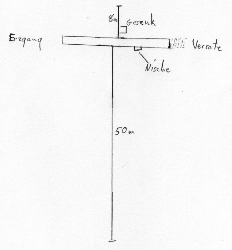 Die Entfernung zum Schacht beträgt 12m, vom Schacht aus befindet sich diese Nische auf der rechten Seite im Hangenden.