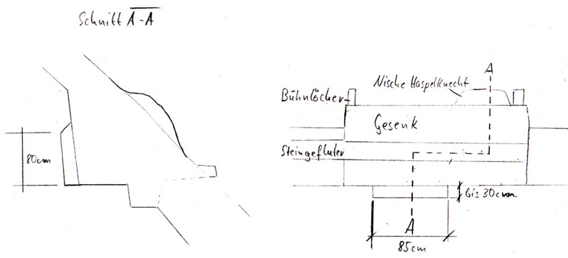 (Eine dauerhafte künstliche Entwässerung des Gesenkes muss bei der Teufung nicht nötig gewesen sein. Anfallendes Wasser aus der Strecke konnte duch die Gefluter geführt werden.)