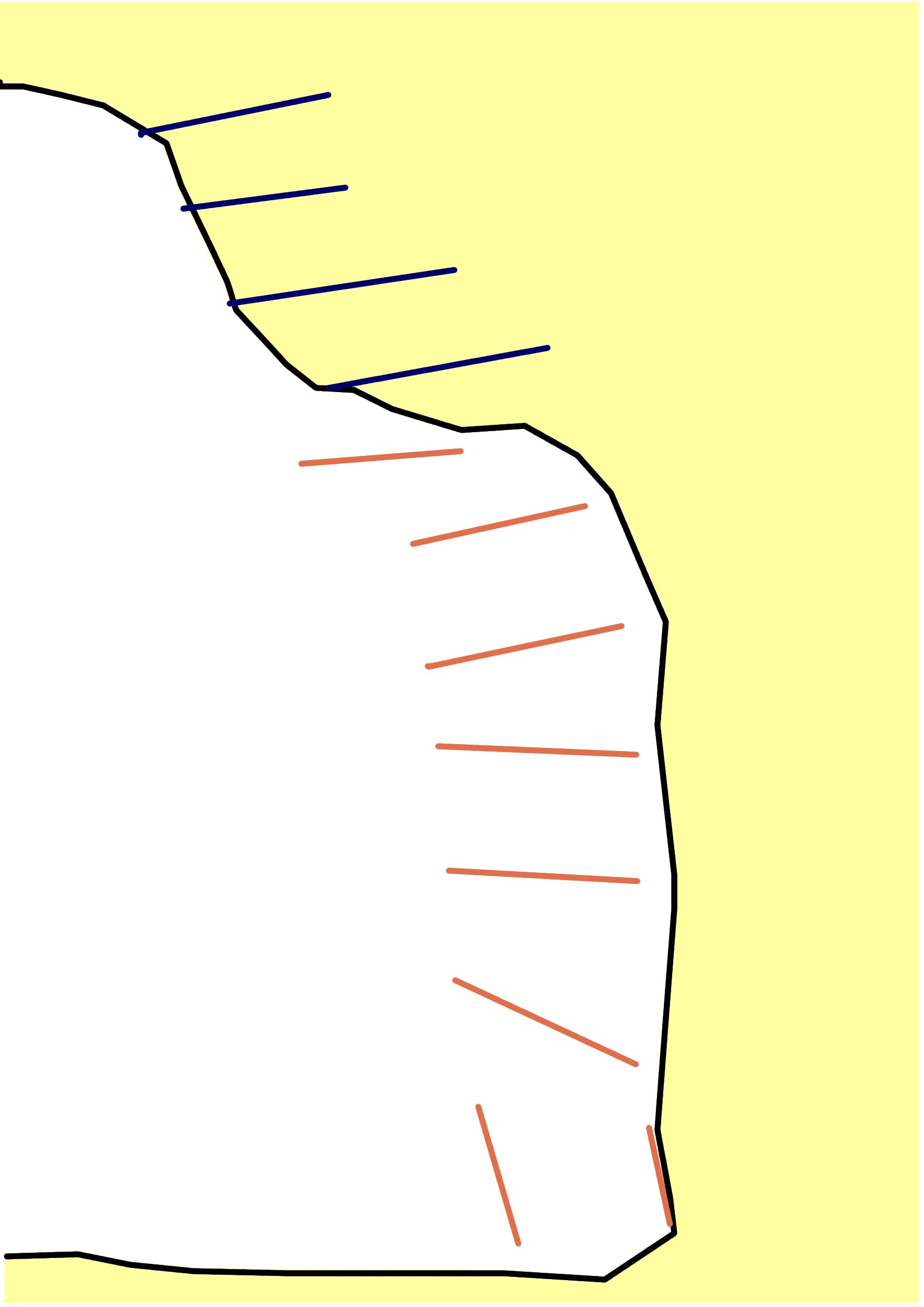 Hier mal noch eine Skizze in der Ansicht von der Seite. So in etwa ist die Situation. Blau die noch vorhandenen Borhlöcher mit den "2 Blindgängern" und Rot die geschätzte Lage der erfolgten Schüße mit der Bohrpfeife des Einbruchs.
