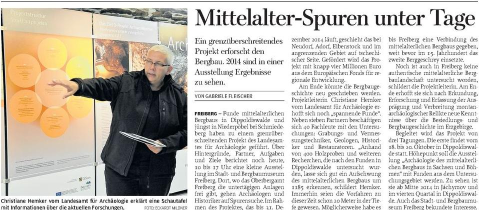 Das Ziel 3-Projekt „ArchaeoMontan- Mittelalterlicher Bergbau in Sachsen und Böhmen“ ist ein deutsch-tschechisches Gemeinschaftsprojekt, das die Erfassung und Untersuchung montanarchäologischer Relikte zum mittelalterlichen Bergbau in ausgewählten Regionen im gemeinsamen Grenzraum, die Organisation mehrerer Tagungen sowie die Erstellung und Durchführung einer Wanderausstellung (AP 4) zum Projektthema in Jáchymov und Dippoldiswalde beinhaltet.