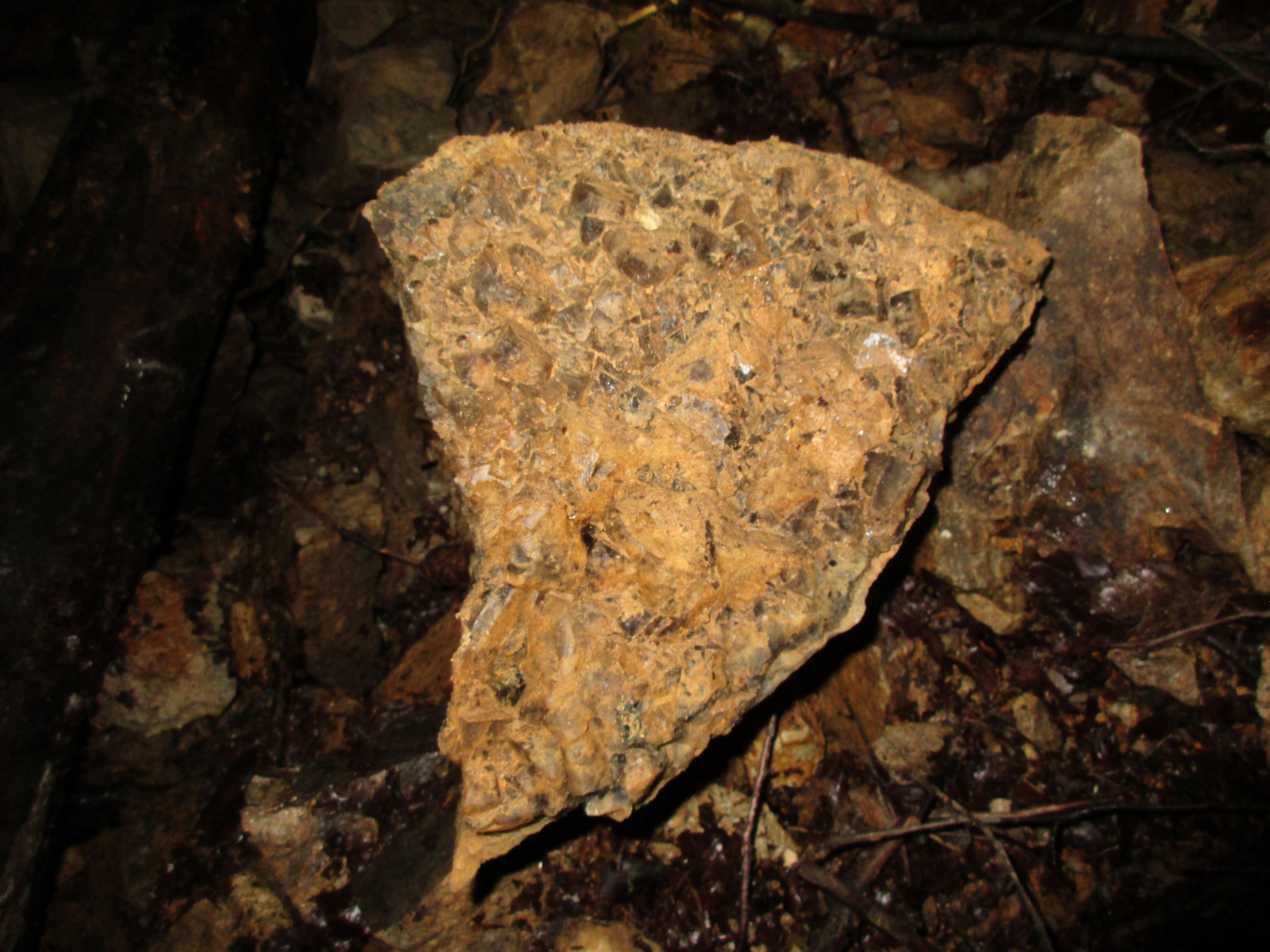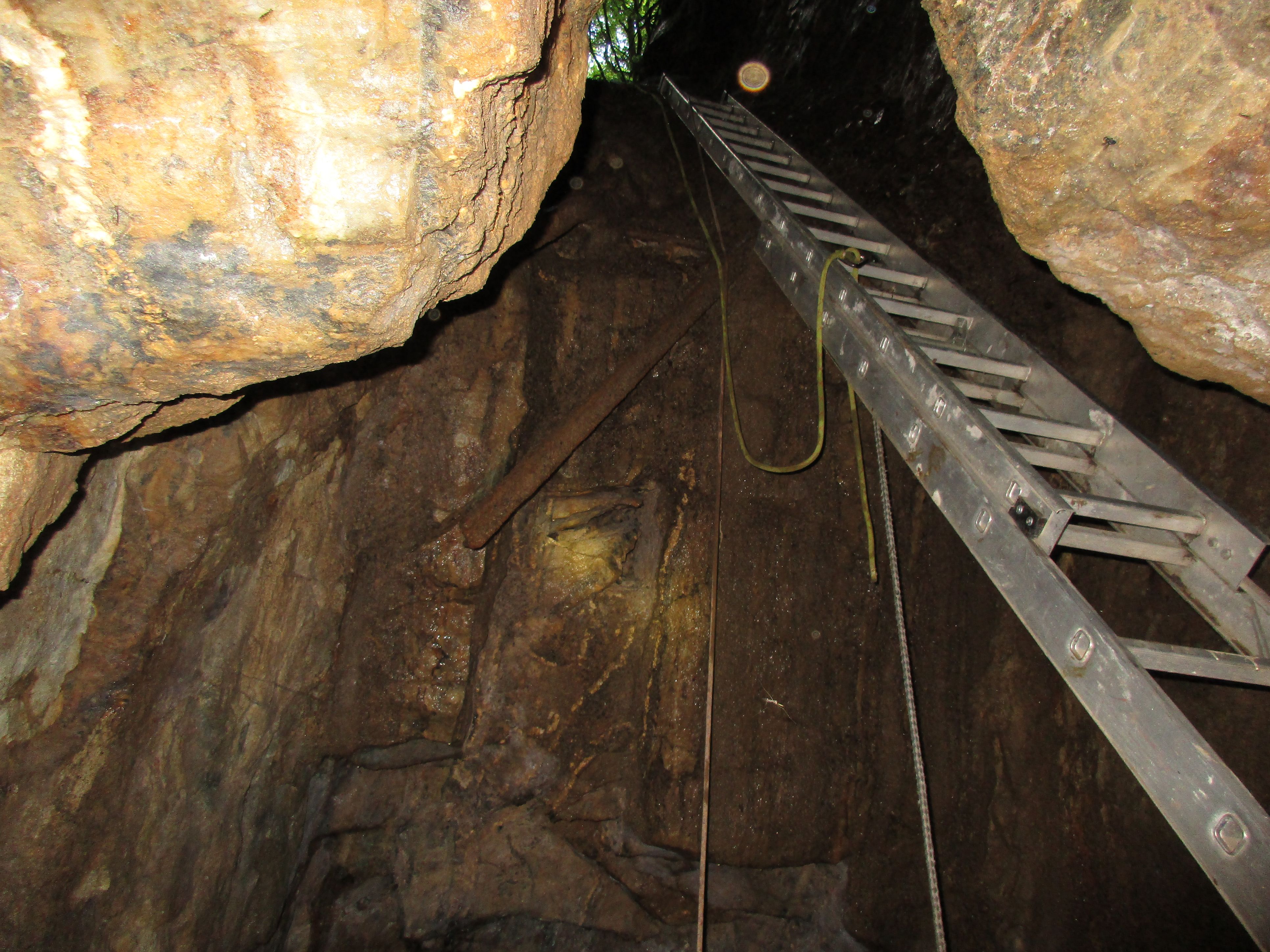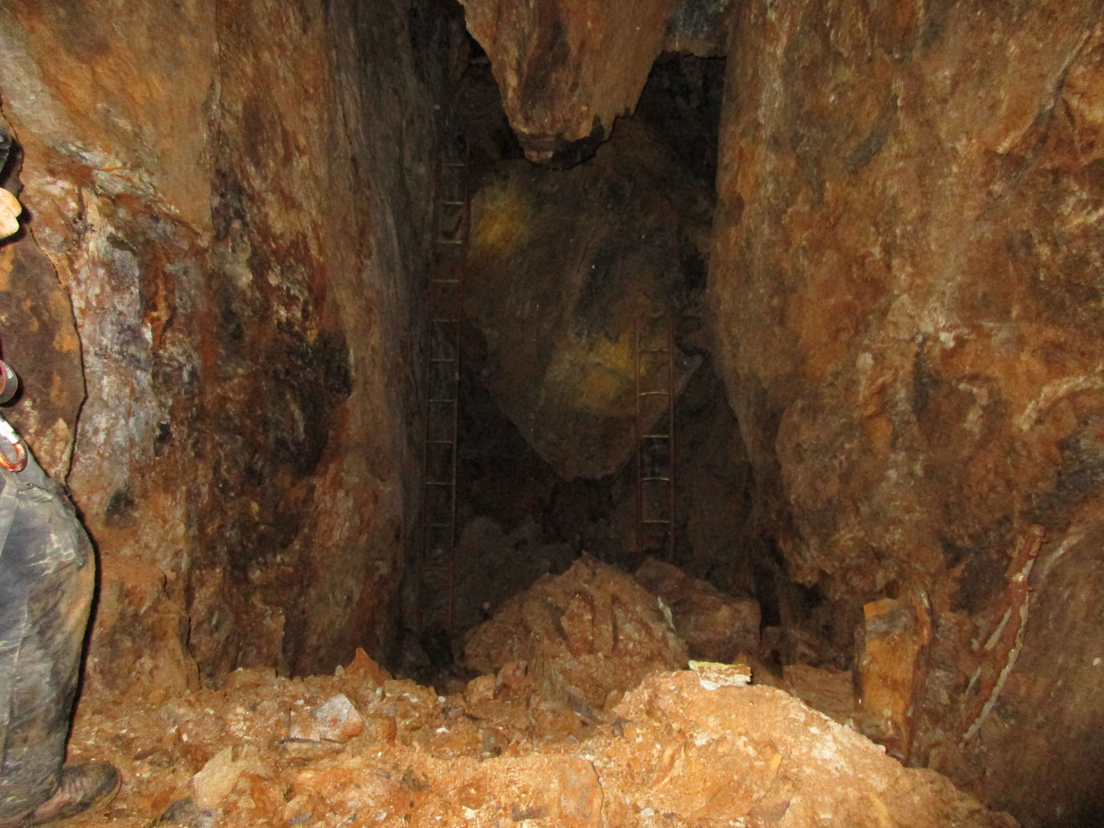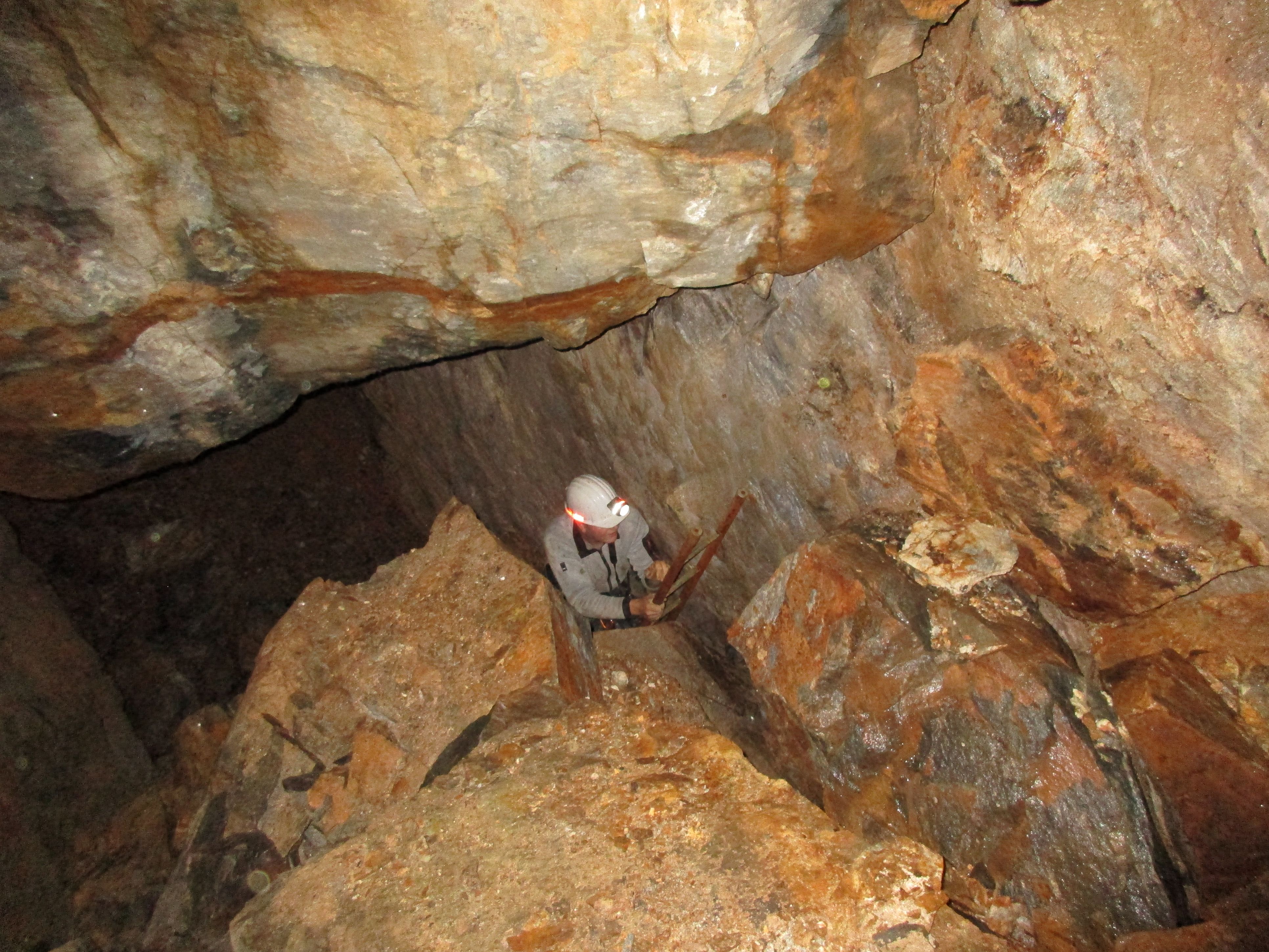 Wir haben uns das Grubengebäude angeschaut und mussten feststellen, dass die Bude sehr instabil ist. Geborstene Hölzer liegen überall rum und riesge Gesteinsbrocken liegen auf der Sohle ( Sohle oder Nachfall ? ). Es macht keinen Sinn, dort irgendwie Mineralien zu bergen, denn man muss am Seil wieder hoch.