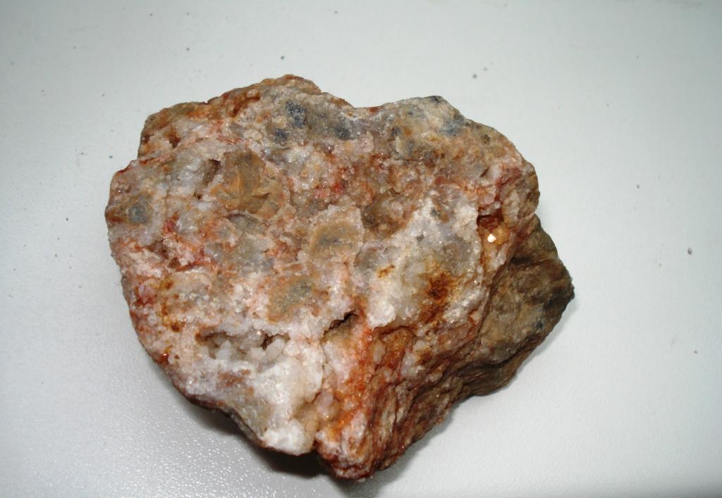 Quarz mit zelliger Struktur - eventuell Kristallnegative von Fluorit (weiß), Fluorit (grün) und ein leichter Überzug von Limonit (braun)