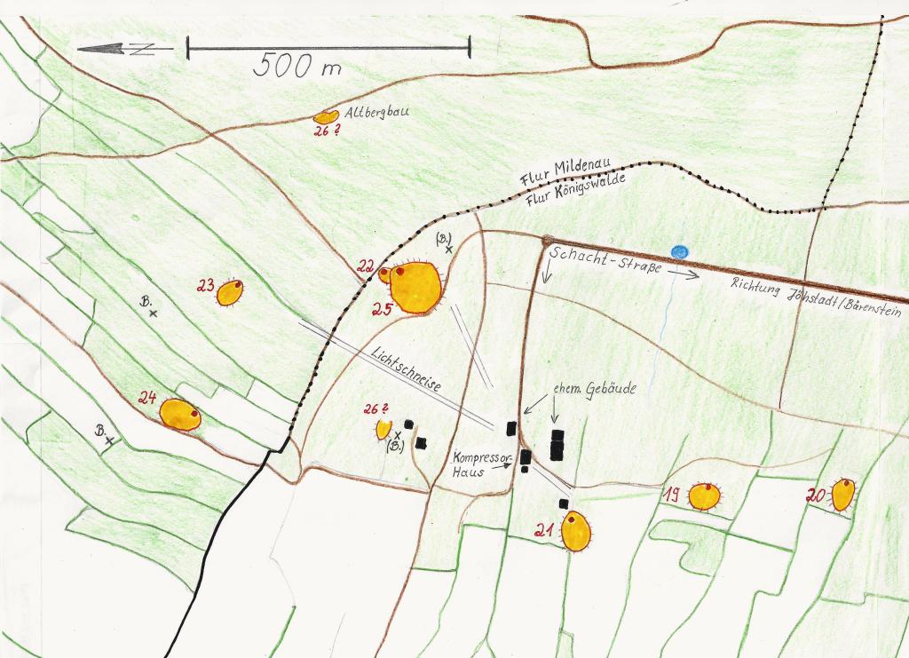 Vielleicht ist die wenig effektive Grubenbauweise genau der Hauptgrund einer schnellen Einstellung des Betriebes und wenige Schritte entfernt zur Neuabteufung des seigeren Schurfschachtes 25. Dafür spricht auch die laufende Nomenklatur und das Fehlen der 22 in den Unterlagen.
