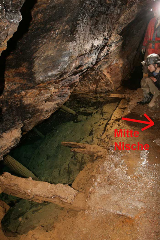 Die im Anfangsposting beschriebenen Bilder 8 und 9 zeigen die gleiche Nische. Auf diesen Bildern ist das Gesenk voll Wasser, was wohl der Jahreszeit geschuldet war. Jetzt ist das Gesenk trocken und bis zur Masse ca. 8m tief (siehe Bild "Gesenk"). Es ist eine mittig zum Gesenk angelegte Nische. Ein Haspelort befand sich dort nicht.
