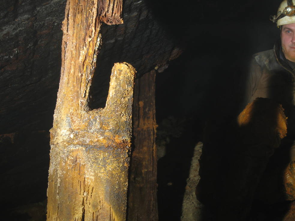 Die einmännische Haspel hatte zwei Haspelstützen, die von der Sohle bis an die Firste reichten. SIe war so konstruiert, dass die Haspelwelle (die fehlte aber) in der kleineren Stütze nicht eingelegt, sondern eingezapft wurde. Auf der anderen Seite in die Haspelstütze eingelegt, so wie weiter oben auf dem Bild zu sehen. Eine genaue Vermessung und Dokumentation steht noch aus. Im tonnenlägigen Schacht lagen noch die Bretter, auf denen der Förderkorb/Kübel bzw. die Bulge gelaufen ist. Übrigens war genau hinter der Haspel eine geschlägelte Nische ...