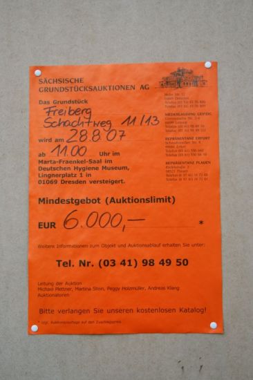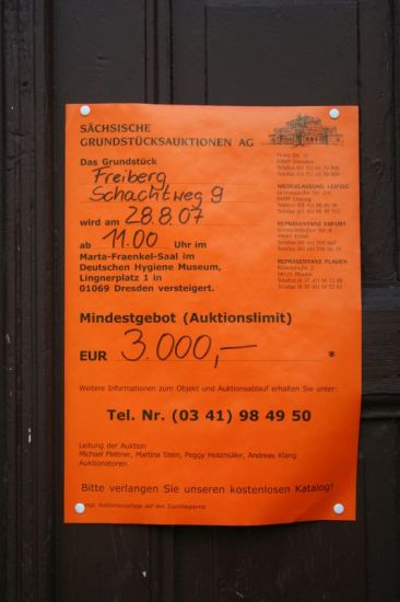 Die Schlechte: Die Setzwäsche (Nr. 9) ist für 3000 € an einen türkischen "Immobiliensammler" gegangen, der alles unter 10000 € gekauft hat und nach der Versteigerung im Atlas nachgeschaut hat, wo Freiberg liegt