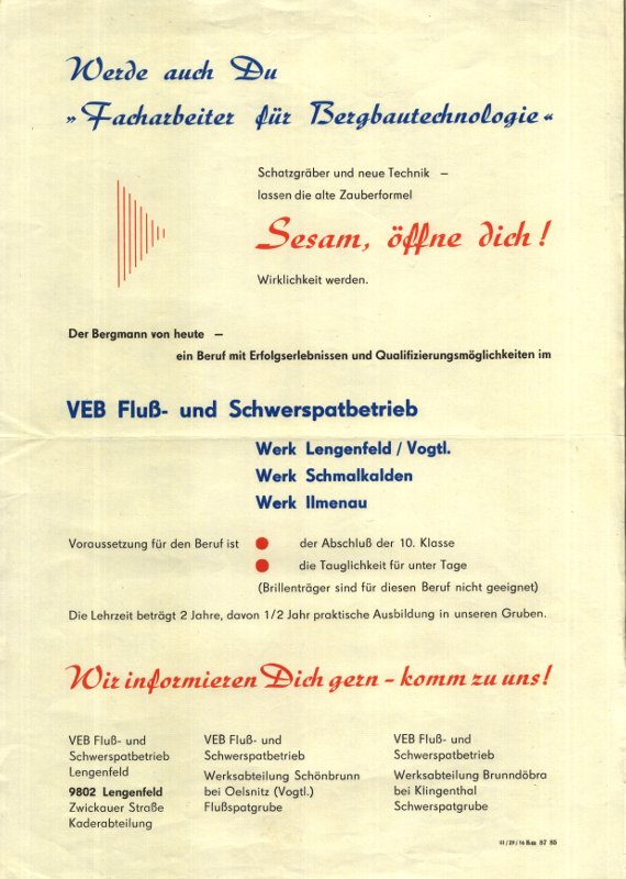 Beim Aufräumen im Bücherschrank fand ich dieses "fast" aktuelle Werbeprospekt des VEB Bergbau- und Hüttenkombinates Freiberg/Sa. 1977 wurden dringend Lehrlinge für den Bergbau gesucht. Dafür hat man sogar einen Prospekt in Farbe und auf Glanzpapier herausgegeben, trotz Mangelwirtschaft der DDR! Hier nun einige Auszüge über die wir sicher schmunzeln werden.