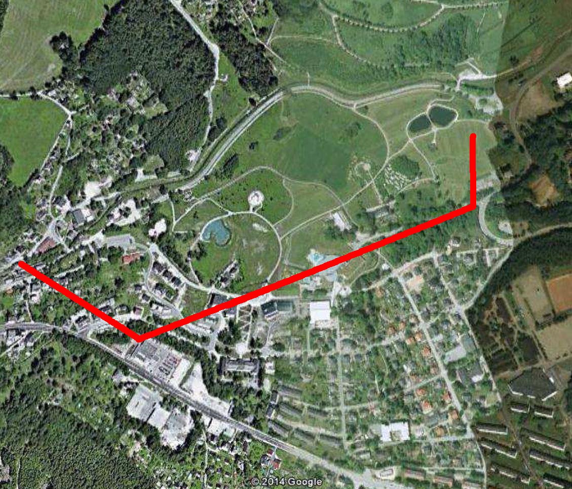 Unter dem Kurpark ist natürlich völliger Blödsinn. Der ist ja das Senkungsgebiet. Zum besseren Verständnis die Trasse in etwa in Natur.