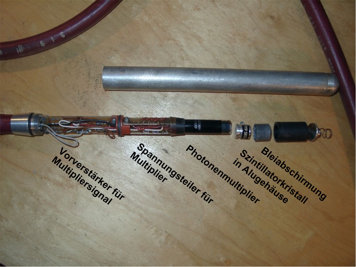 Der PMT sitzt in dem hinteren schwarzen, röhrenförmigen Teil des Gehäuses. Ich gehe davon aus, daß dieser defekt ist, vermutlich daher wurde der Detektor ausgesondert.