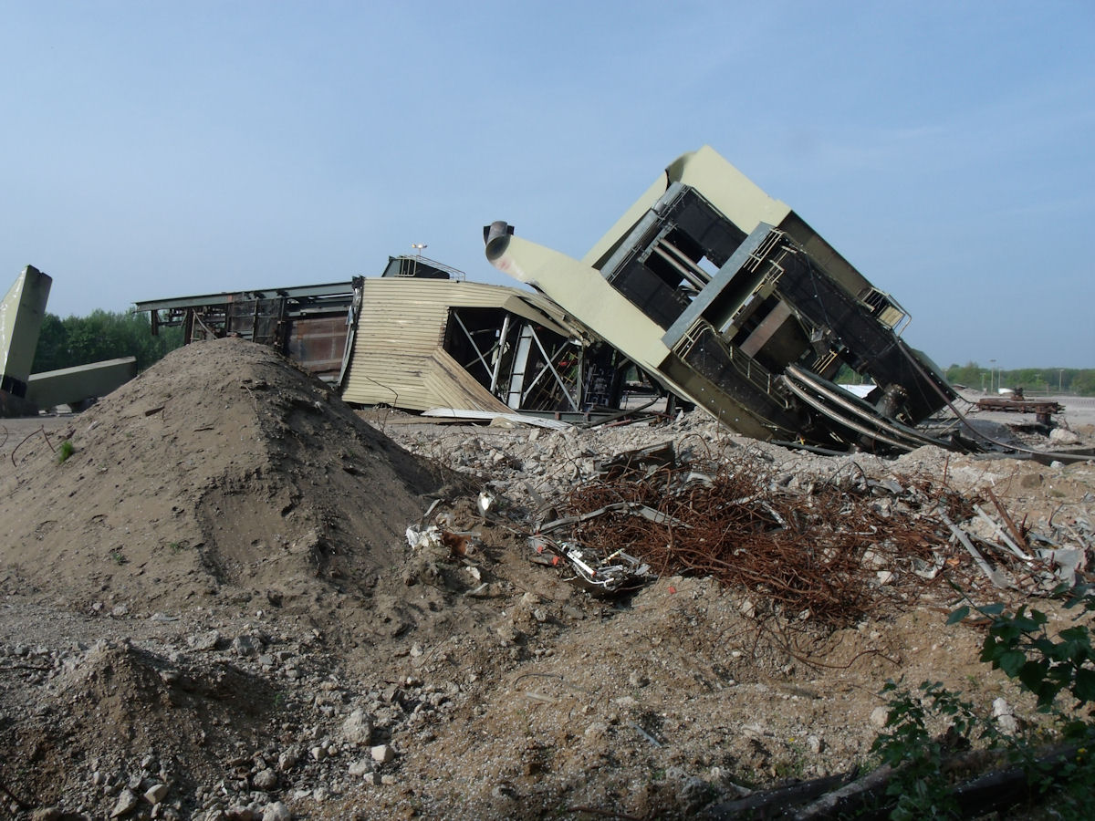 Heute morgen um 9:00 Uhr wurde das Fördergerüst des Schachtes Voerde umgelegt und damit der letzte Rest der Tagesanlagen auf dem ehemaligen Außenschachtgelände des BW Walsum beseitigt. Walsum wurde 2008 nicht zuletzt wegen des umstrittenen Abbaus unter dem Rhein stillgelegt. Der erst 1986 geteufte Seilfahrts- und Materialschacht Voerde daraufhin 2009 abgeworfen und verfüllt. Seit 2011 wüteten die Bagger. Jetzt wird das Gelände wahrscheinlich in eine landwirtschaftliche Nutzung zurückgeführt.