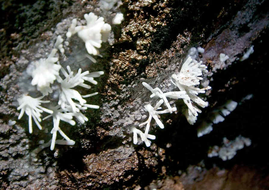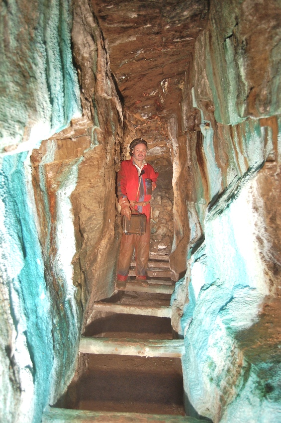 Mal ein Bild aus dem Halsbrücker Revier. Sekundäre Mineralbildung Aragonit + Kupfer auf einem noch erhaltenen und fahrbaren Trakt des "Anna Stolln".