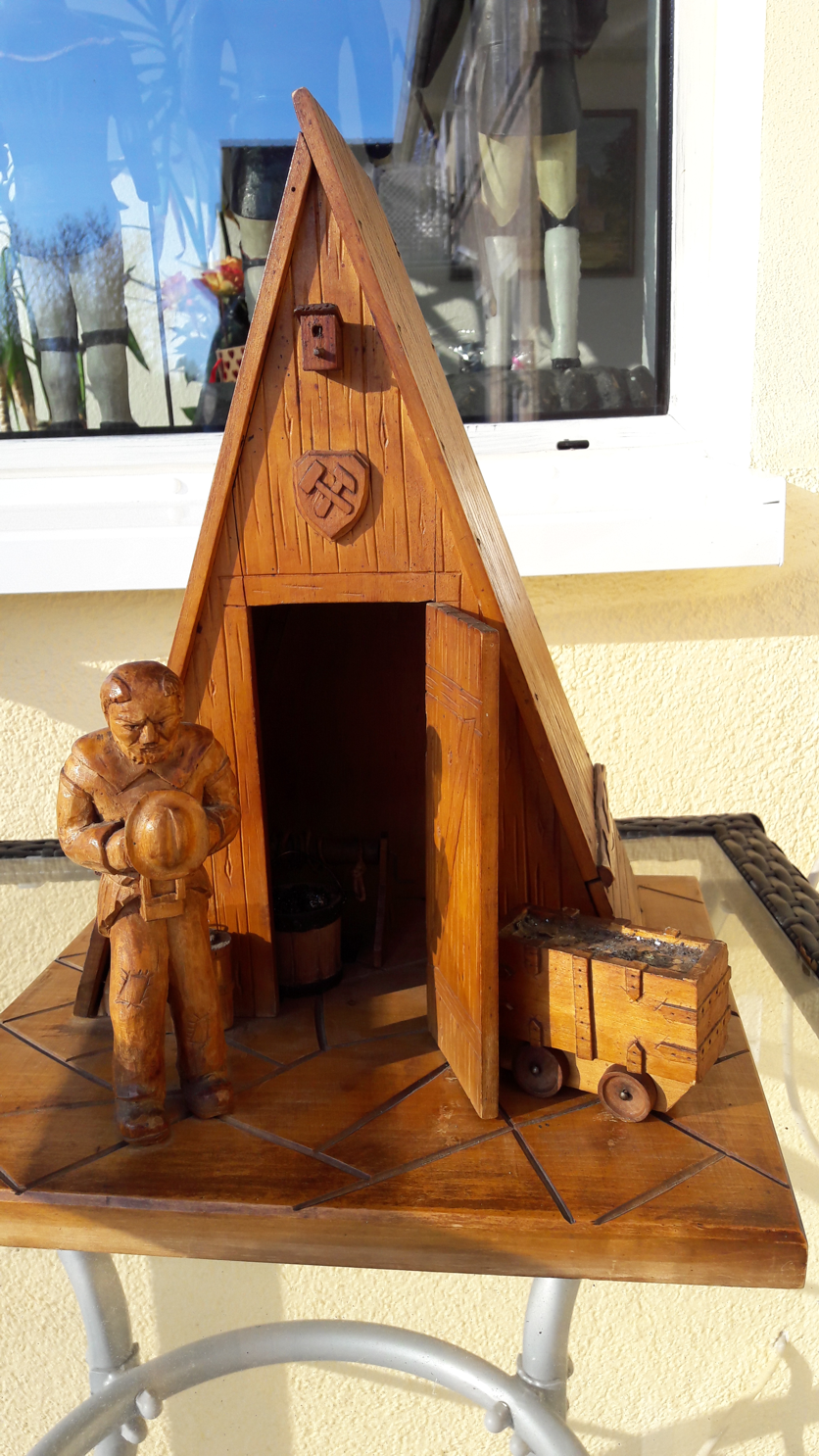 Jetzt habe ich eine weitere Kaue bekommen, die offensichtlich vom gleichen Schnitzer stammt. Vorbild wird hier der "Betende Bergmann vor der Kaue" von Ernst Dagobert Kaltofen (siehe https://www.deutsche-digitale-bibliothe ... mvpr/1.jpg) gewesen sein. Natürlich kann auch Kaltofen ein Vorbild gehabt haben, denn die Lithografie mit dem Bergmann vor der Kaue ist schon älter, aber das Vogelhaus an der Kaue, der Hunt und der Kübel vor der Kaue deuten schon auf einen direkten Zusammenhang zwischen beiden Werken bzw. auf eine gemeinsame Vorlage.