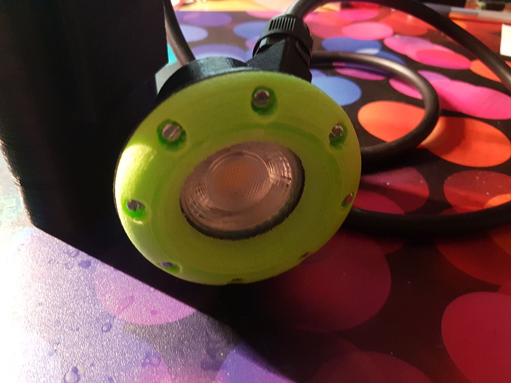 ich wollte mal mein selbstgedrucktes Geleucht vorstellen. Über die Sinnhaftigkeit kann man sicher streiten, aber ich habe das Ding jetzt schon ein paar Mal UT gehabt und kann nicht klagen. Anbei ein paar Bilder - Leuchtdauer etwa 7 Stunden, geladen wird mit einem 5 Volt Steckernetzteil. Die LED ist ein handelsüblicher 12 Volt LED Reflektor mit GU 5.3 Steckstift und 5 Watt Leistung. Somit ist man in der Farbtemperatur flexibel und kann auch die LED leicht tauschen. Der Ring ist aus PUR und kann einige Schläge ab.