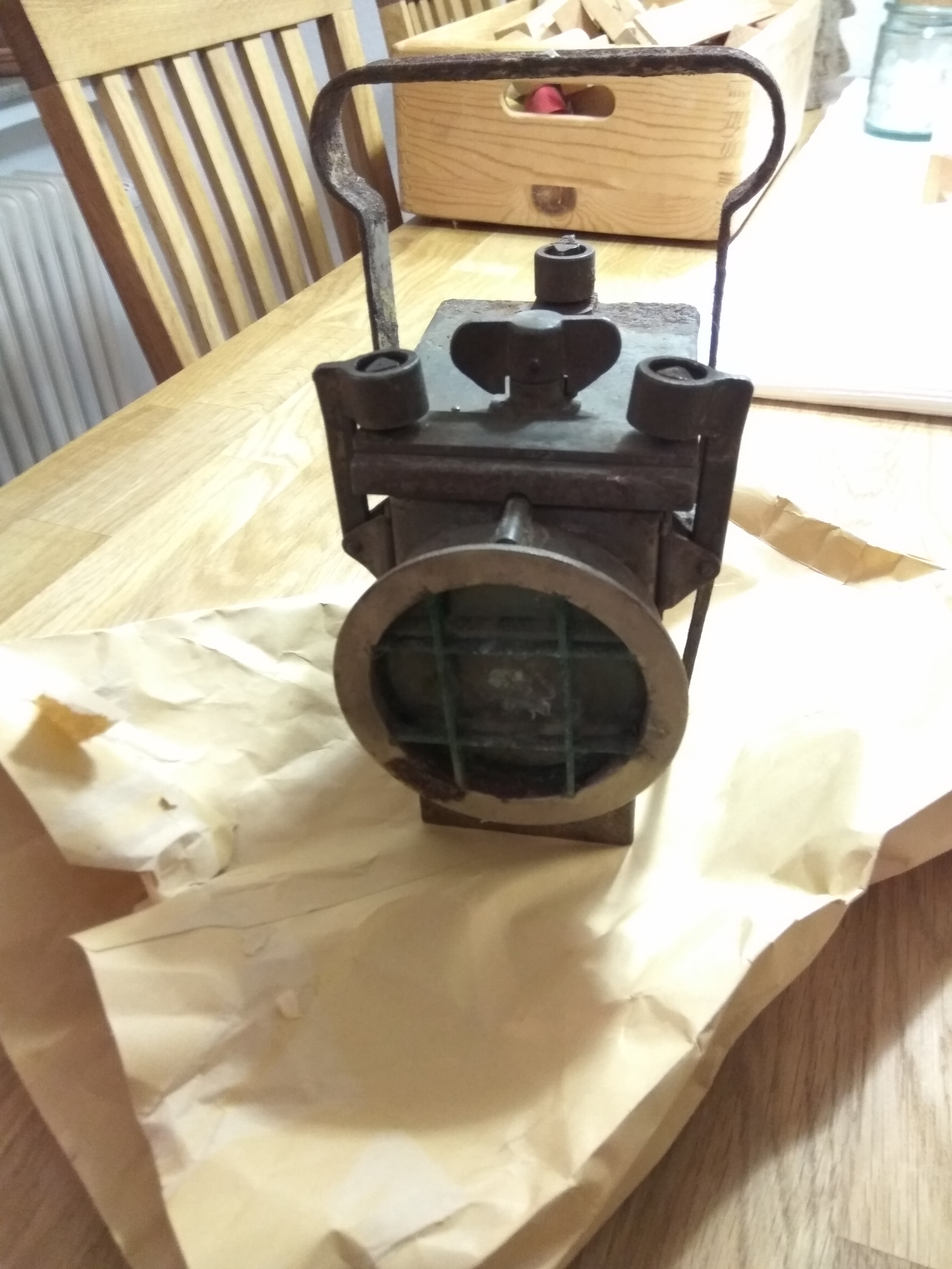 ich weiß nicht, ob ich mit meinem Fundstück, einer Dominit Lampe von 1937 hier richtig bin. Ich habe sie für 5,00 Euro auf einem Flohmarkt erstanden und wollte nun wissen, ob es eine Bergbaulampe ist. Ich möchte sie etwas restaurieren - vielleicht kann ich hier entsprechende Tipps erhalten, wie ich sie geöffnet kriege und wie ich sie am Besten entroste.