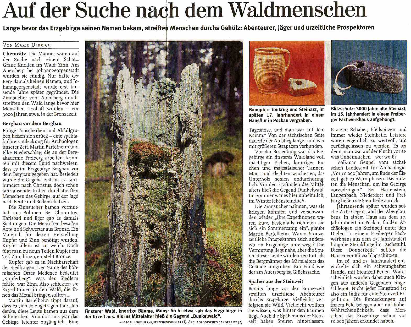 Stand heute sehr ausführlich in der Zeitung. Frau Hemker hat den ältesten Bergbau entdeckt. Was Forscher schon seit Jahren wissen und die eingefleischte Wissenschaft bis heute bestritten hat, ist jetzt eine Sensation. Spätestens seit der Himmelscheibe von Nebra spricht man über das Zinn aus dem Erzgebirge. Dr. Mike Haustein hat dazu umfangreiche Untersuchungen gemacht. (2011/2008) Haustein, M., Pernicka, E.: Die Verfolgung der bronzezeitlichen Zinnquellen Europas durch Zinnisotopie- eine neue Methode zur Beantwortung einer alten Frage, Jahresschrift für Mitteldeutsche Vorgeschichte 92, 387–418. (2007) Haustein, M., Pernicka, E.: Zinnseifen des Erzgebirges- Rohstoffquellen der Bronzezeit? Erweiterte Kurzfassung im Tagungsband „Archäometrie und Denkmalpflege“ 19.–22. September 2007 an der FH Potsdam. Hier http://www.regionalmuseum-bfh.de/bronzezeit oder hier https://de.wikipedia.org/wiki/Aunjetitzer_Kultur kann man auch nachsehen. Die Sensation ist also keine. :aetsch: