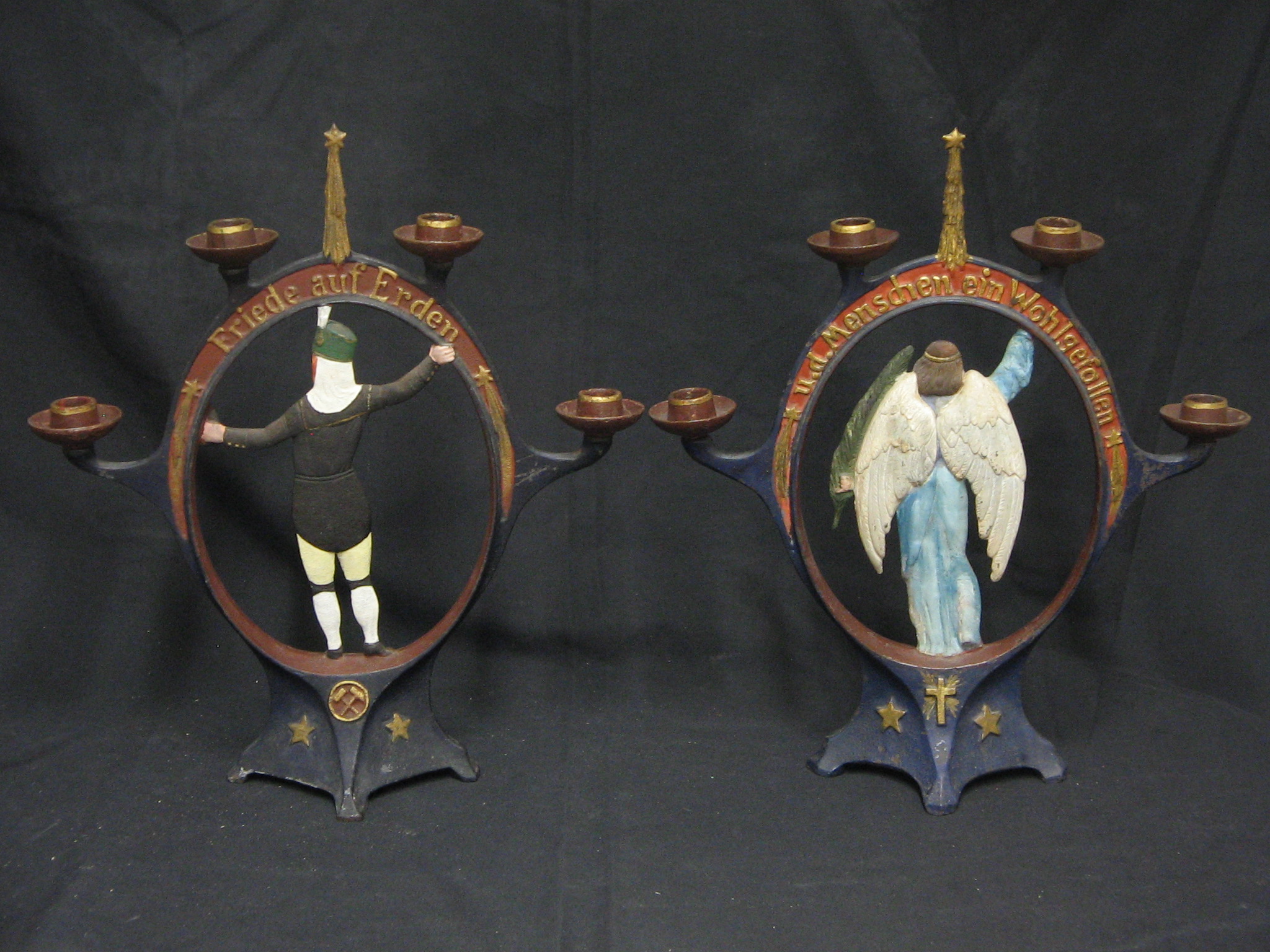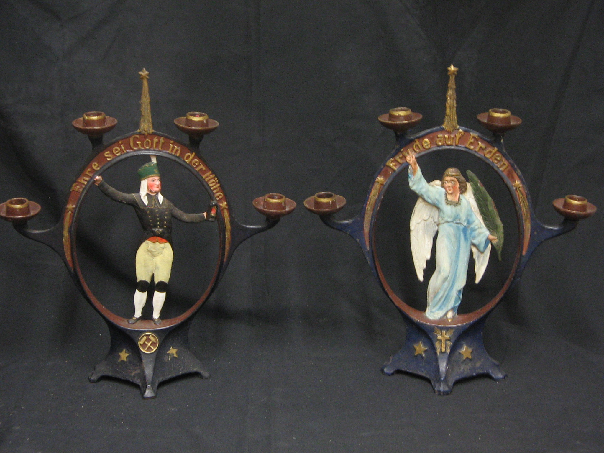 Bisher war mir (und vielen anderen) nicht bekannt, dass es zu dem Bergmann auch einen passenden Engel gibt. Die abgebildeten Leuchter bestehen aus Gusseisen und sind handbemalt. Den Bergmann gibt es auch in einer Zinn-Variante, jedenfalls sind da einige wenige Exemplare (alle unbemalt) bekannt.