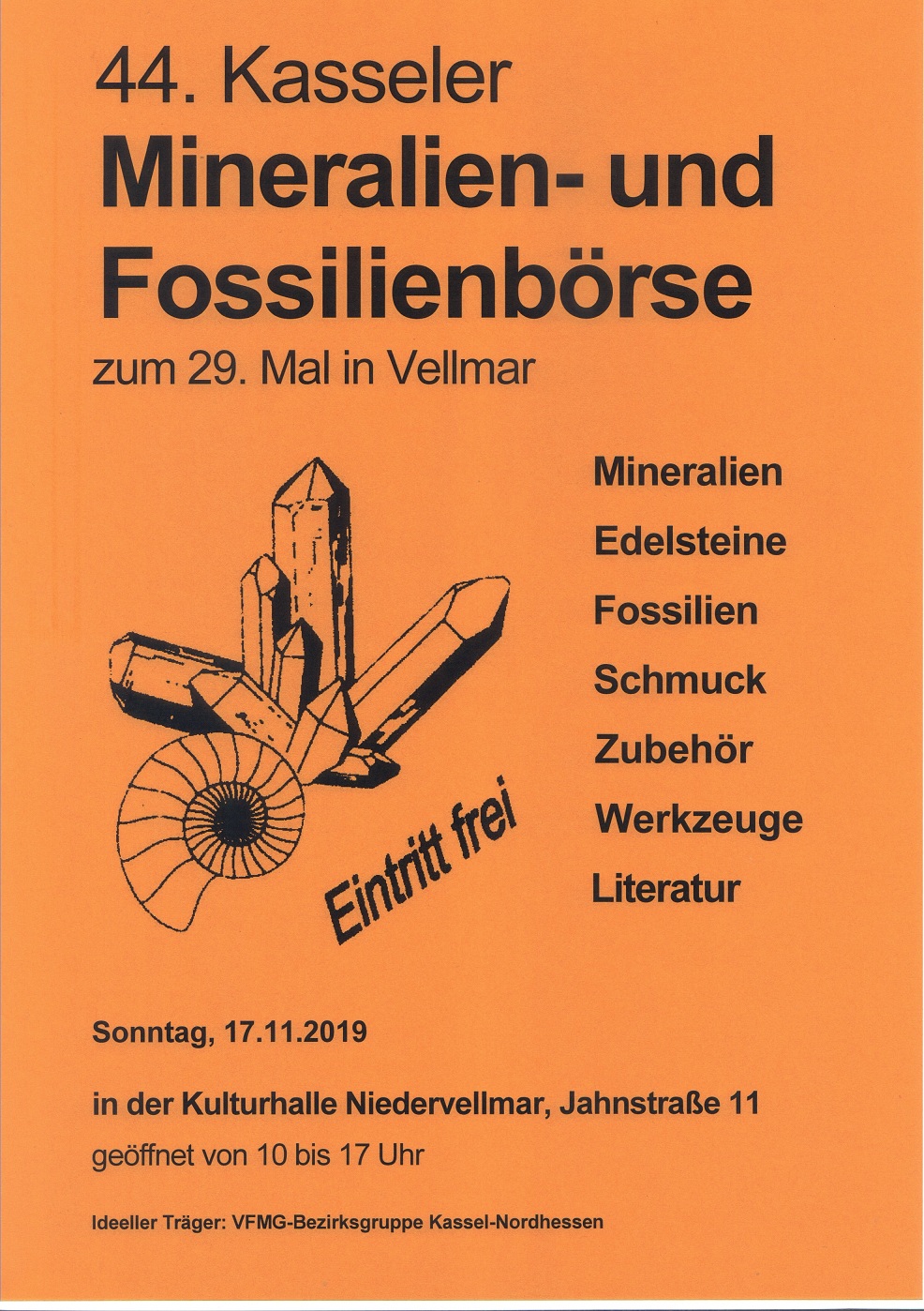 Am 17.11. findet in Vellmar bei Kassel die 44. Mineralien- & Fossilienbörse statt.