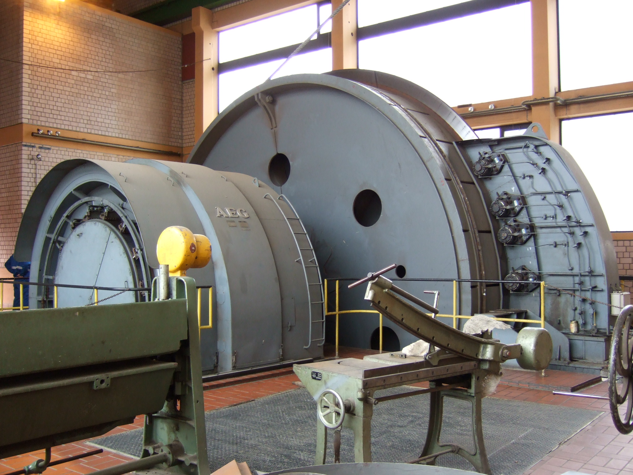 Aüsserst beeindruckend war die Fördermaschine am Nordschacht des Bergwerk Ensdorf im Saarland. Insbesondere wenn sie, wie hier auf dem Bild, gerade anlief. Da spürte man die enormen Kräfte, die auf den 6 Seilen des 1750m tiefen Schachtes lasteten, in jeder Faser des Körpers. Aufnahme vom November 2008.