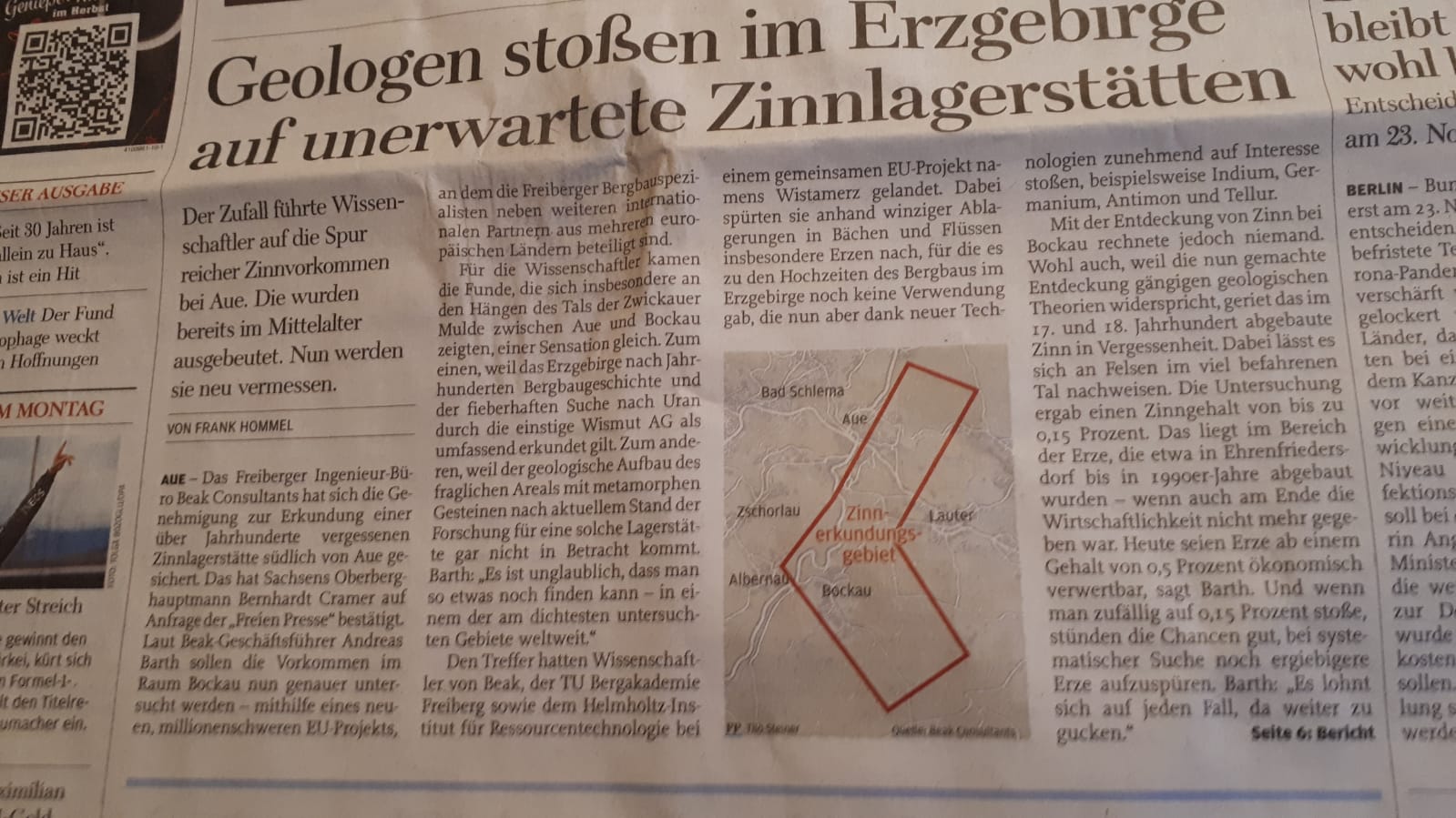 Heute früh wollte mich meine Frau, die Zeitung schwenkend, mit dem Ausspruch: „unerwartete Zinnlagerstätte zwischen Bockau und Aue – warum hast Du die nicht entdeckt?“ überraschen. Nach kurzem Staunen meinerseits und Blick auf die Grafik in der Zeitung, erwiderte ich: „ das weis doch jeder (geologisch-montanhistotisch Interessierte)“.